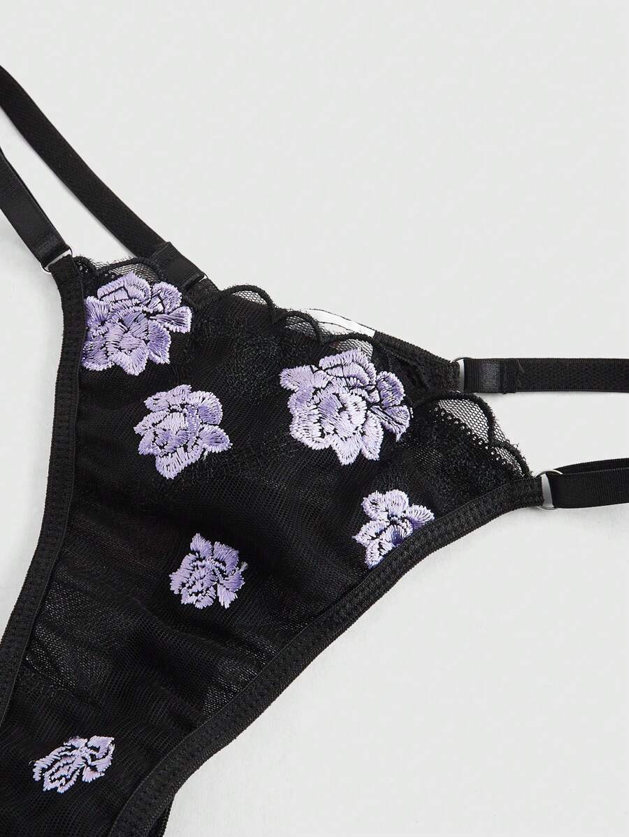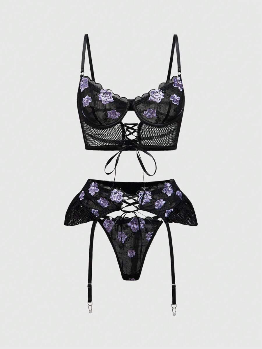 Goth 3pcs/Set Sexy Lingerie Set: Underwired Bra, Suspender Belt, And Thong With Rose Floral Design