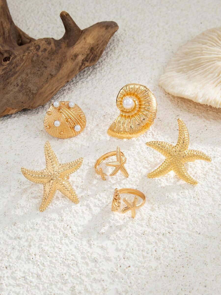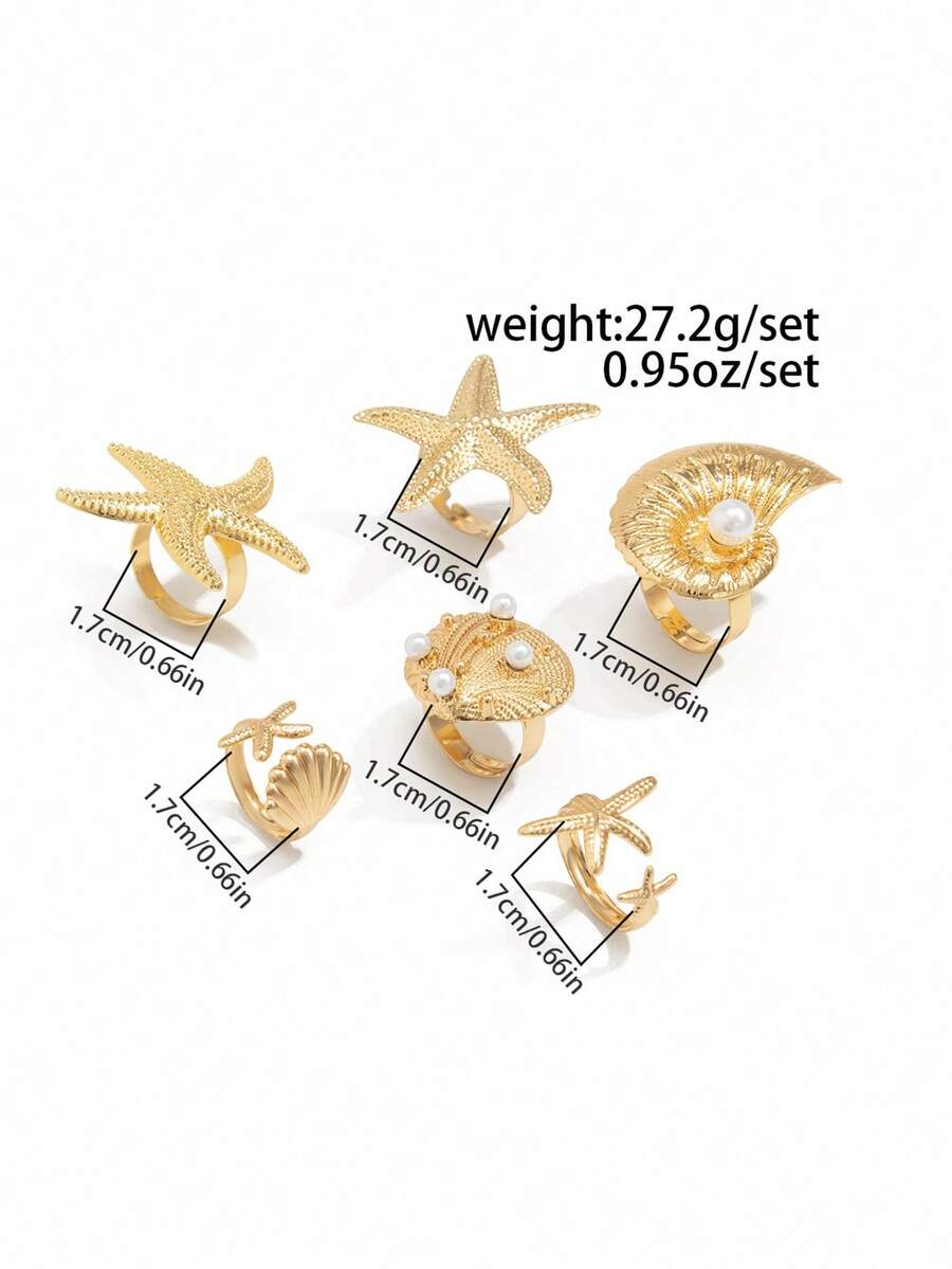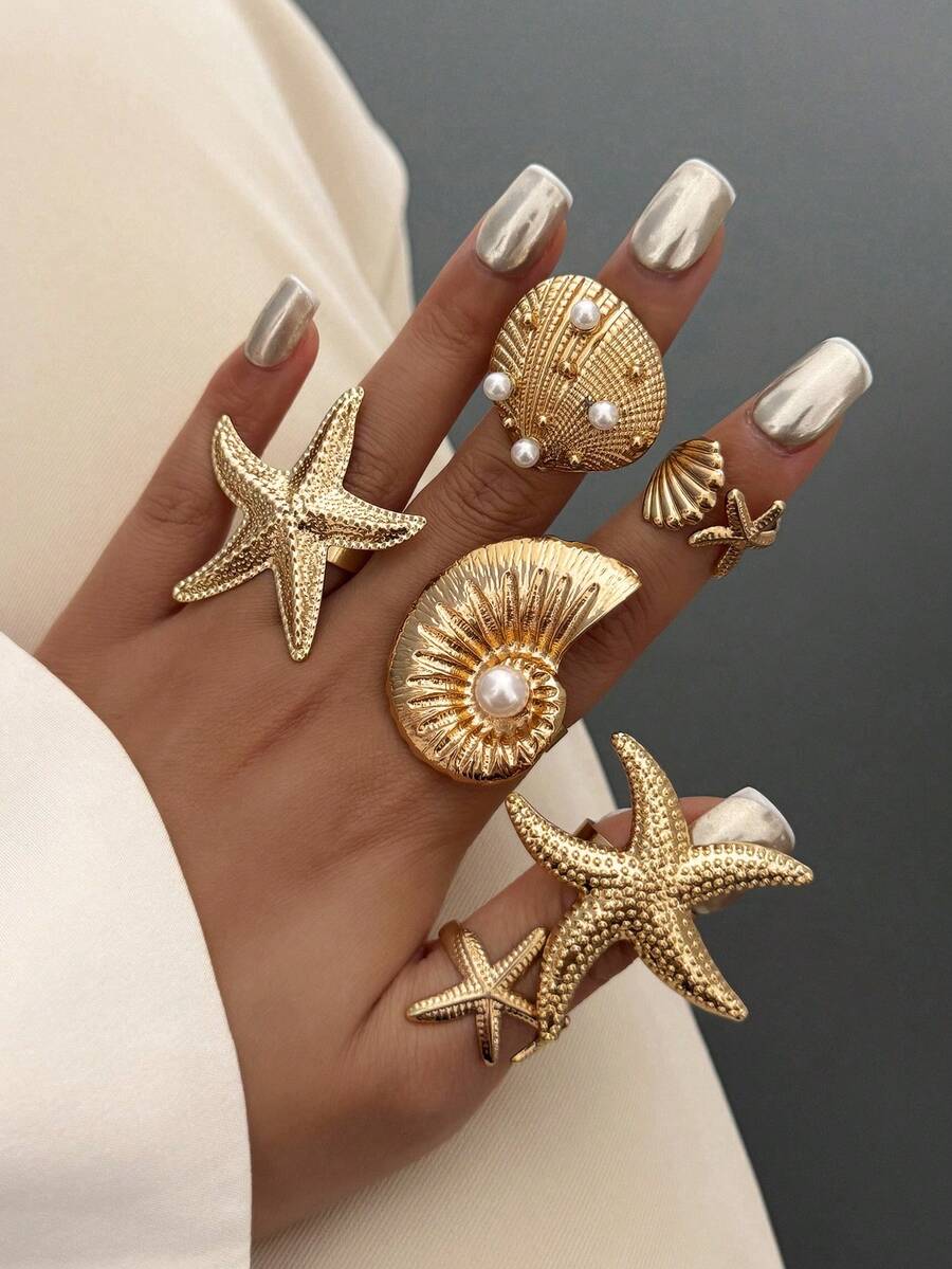 Goth 6 Pcs Fashionable Ocean Style Rings Set - Glossy Starfish, Shell, Geometric Metal Rings, Gold Open Rings, Gifts For Women/Daughters/Wives