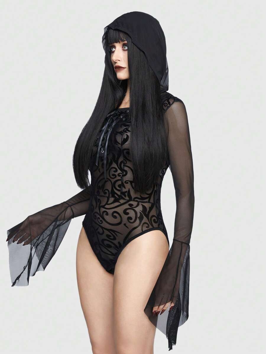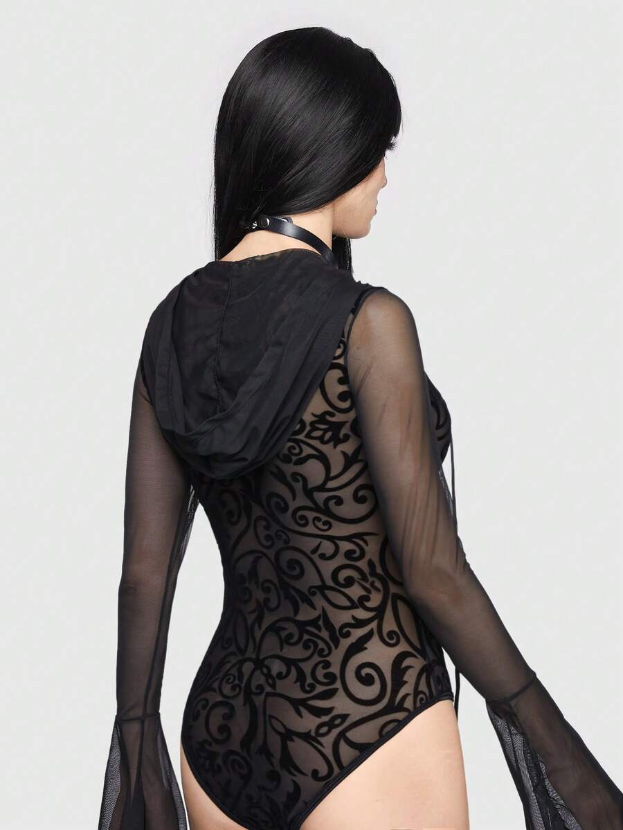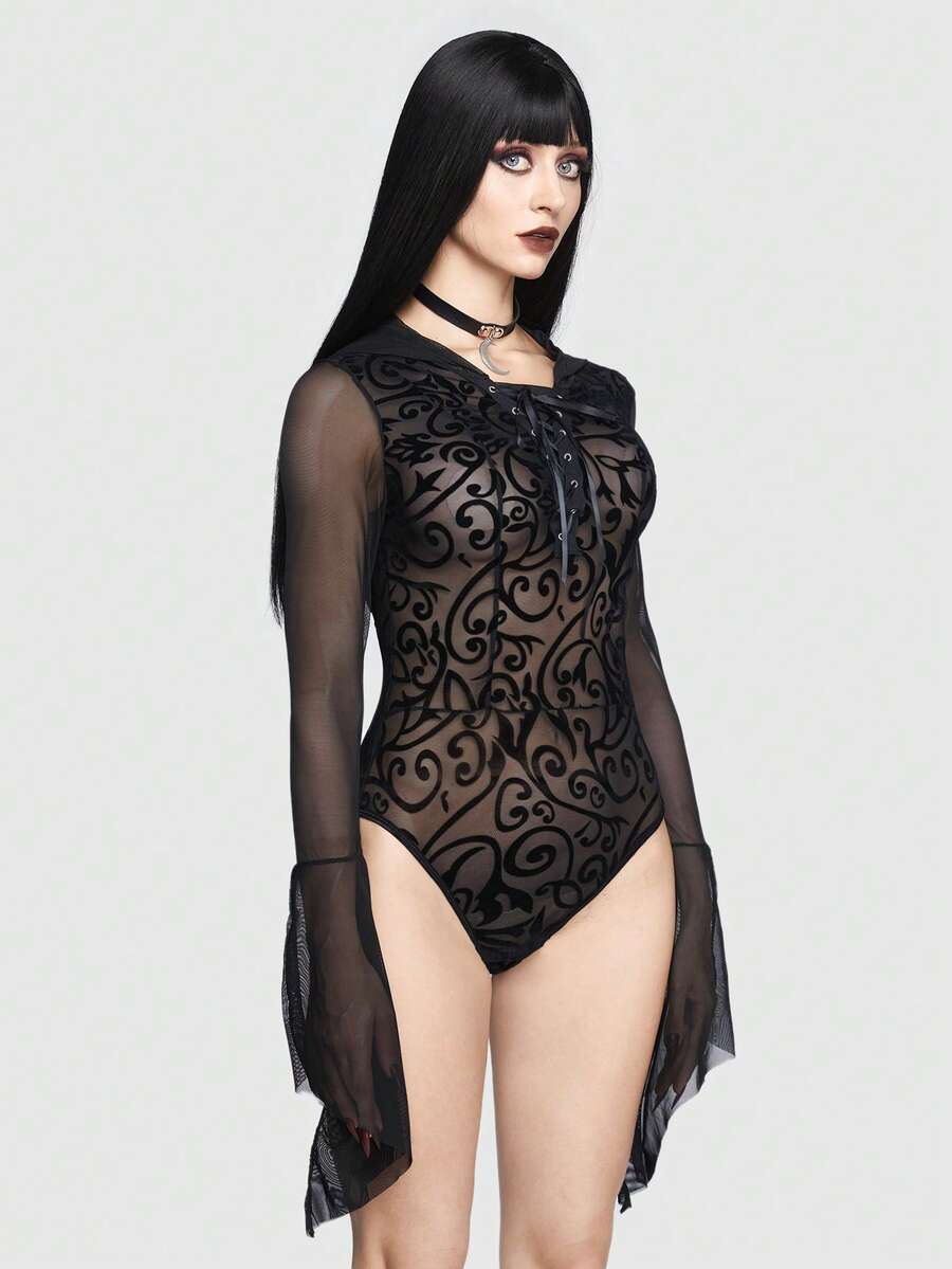 Goth All Over Print Flounce Sleeve Mesh Teddy Bodysuit