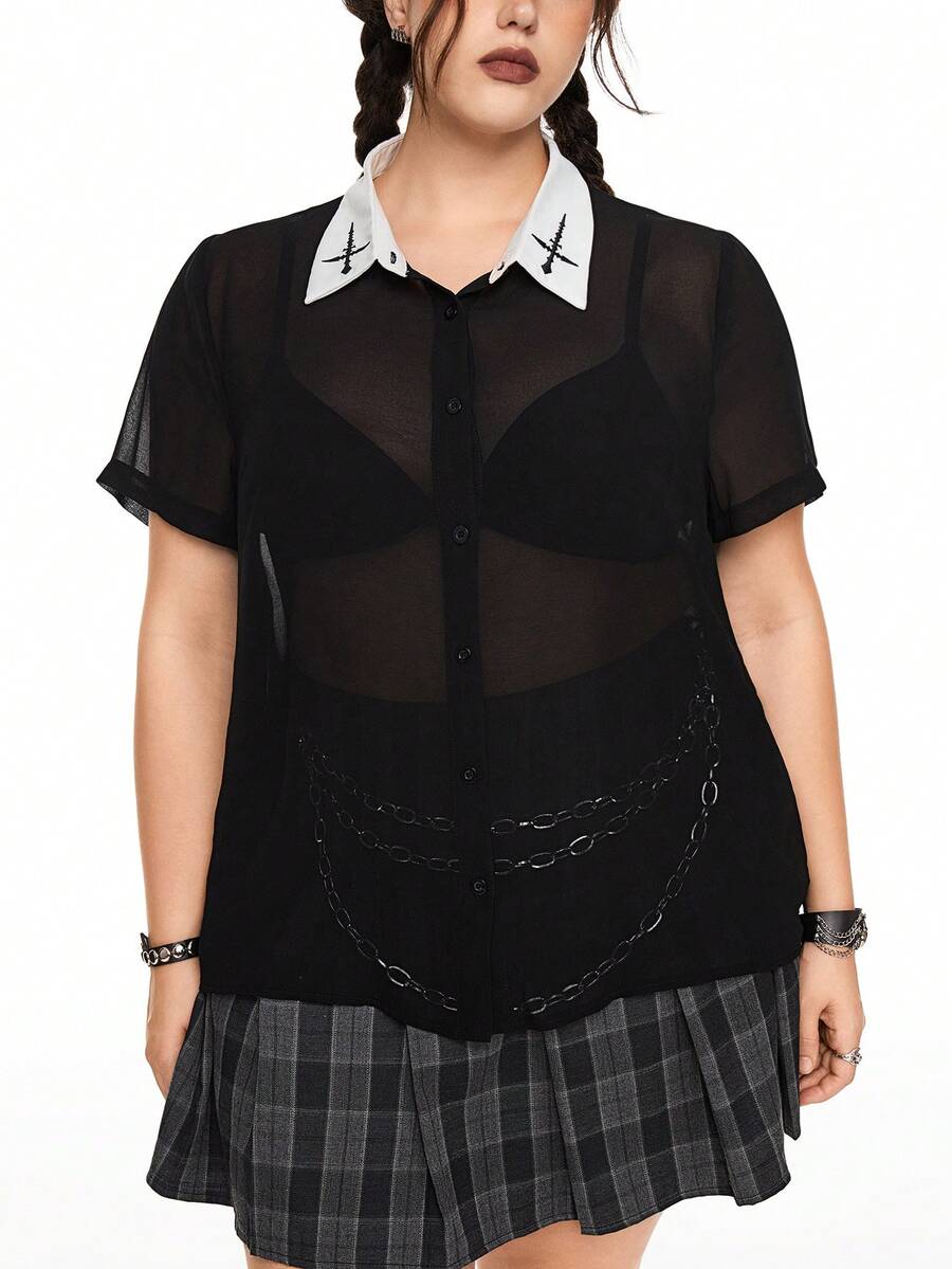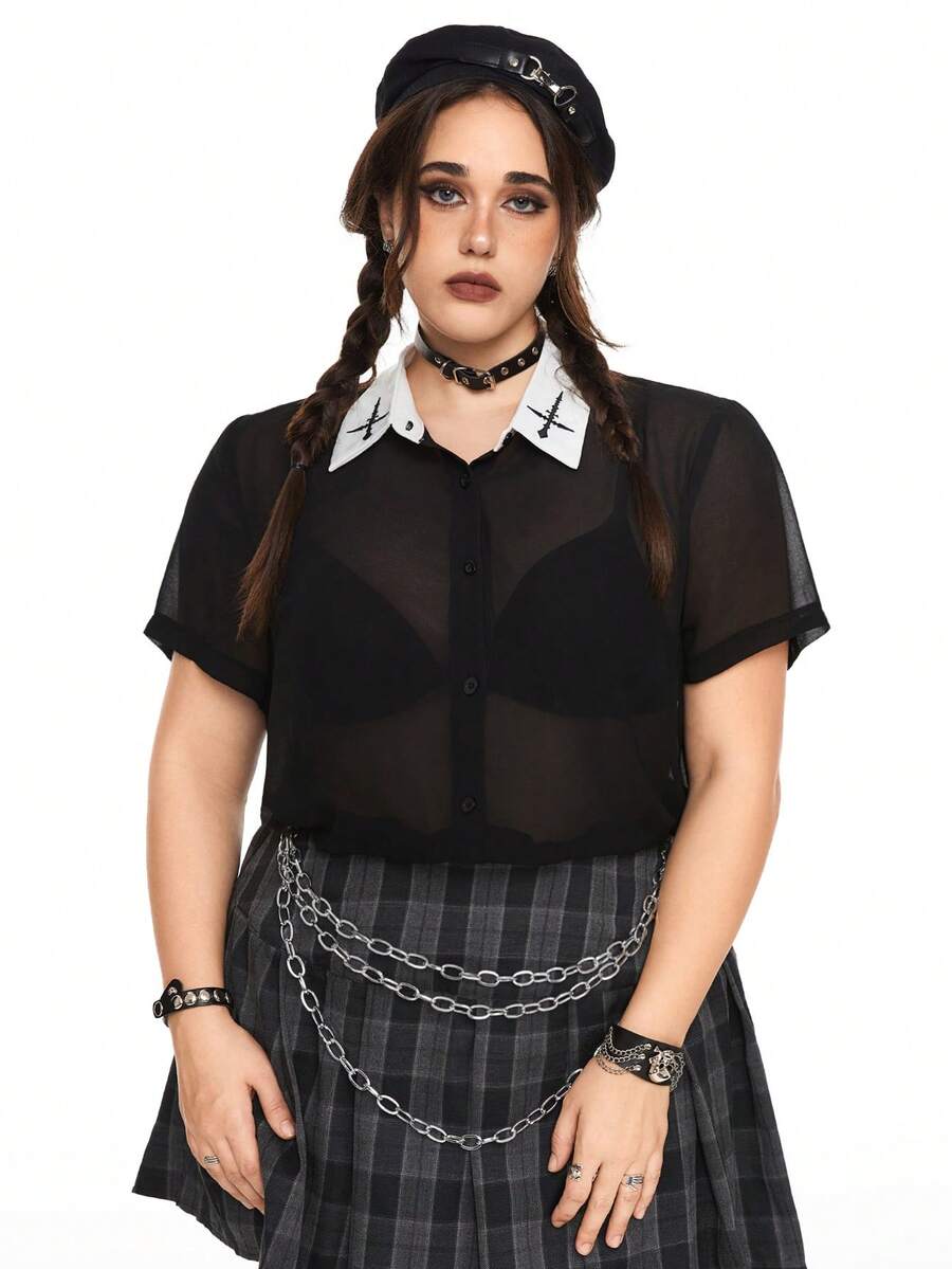 Back To School Gothic Cross Embroidered Plus Size Women Chiffon Loose Top