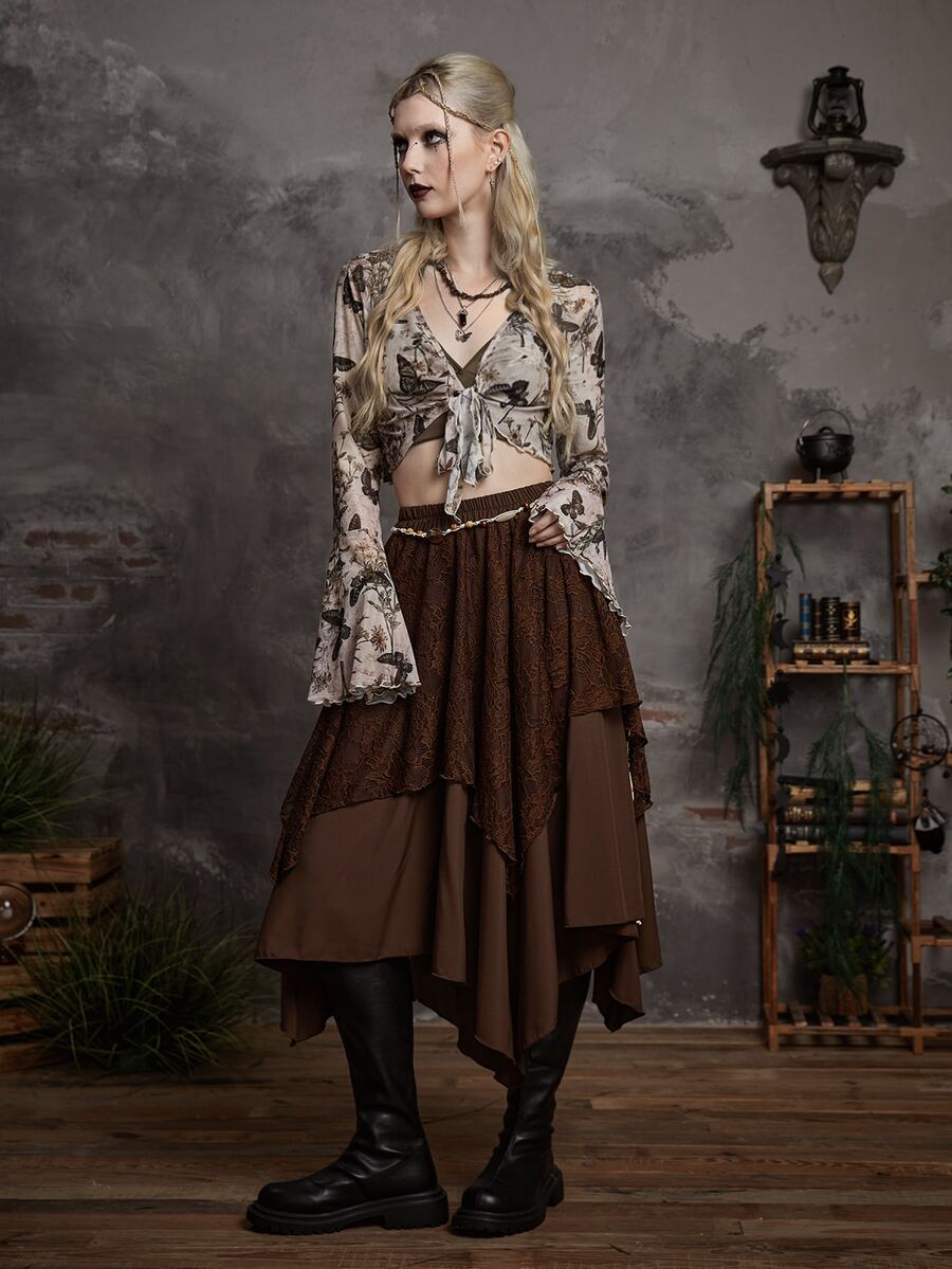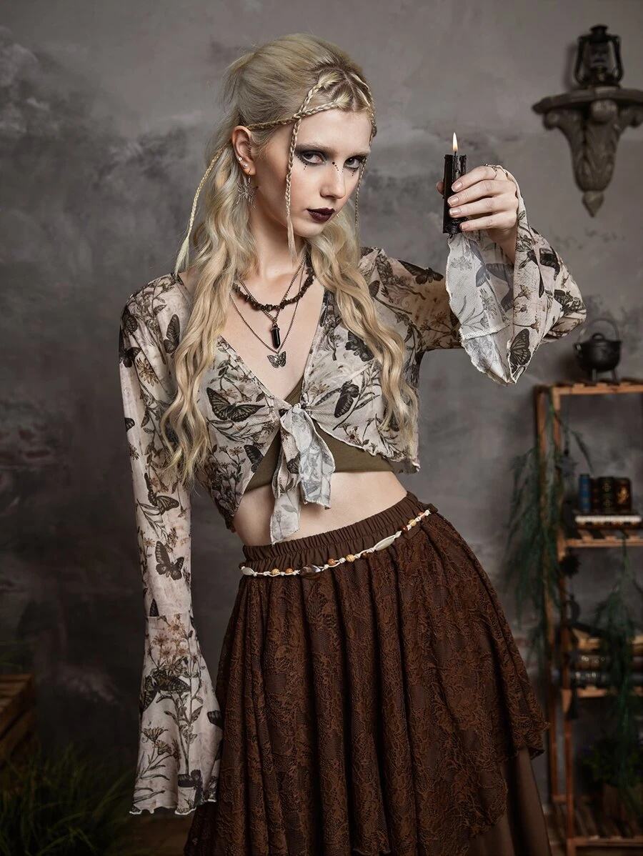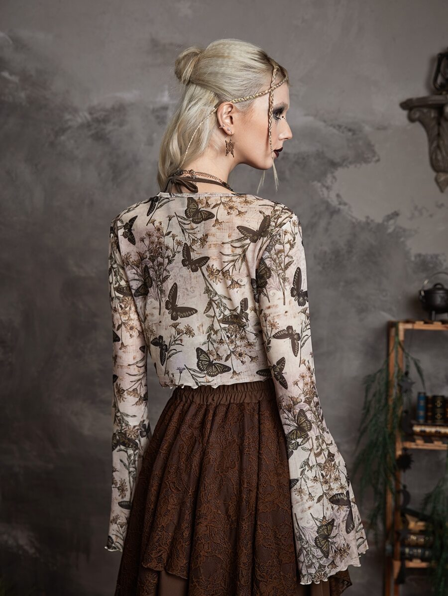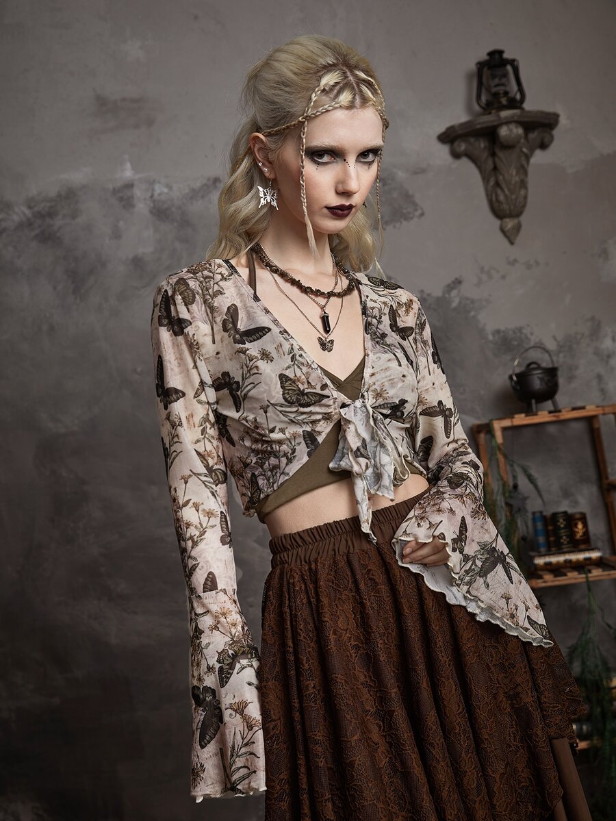 Goth Butterfly & Floral Print Tie Front Flounce Sleeve Crop Top