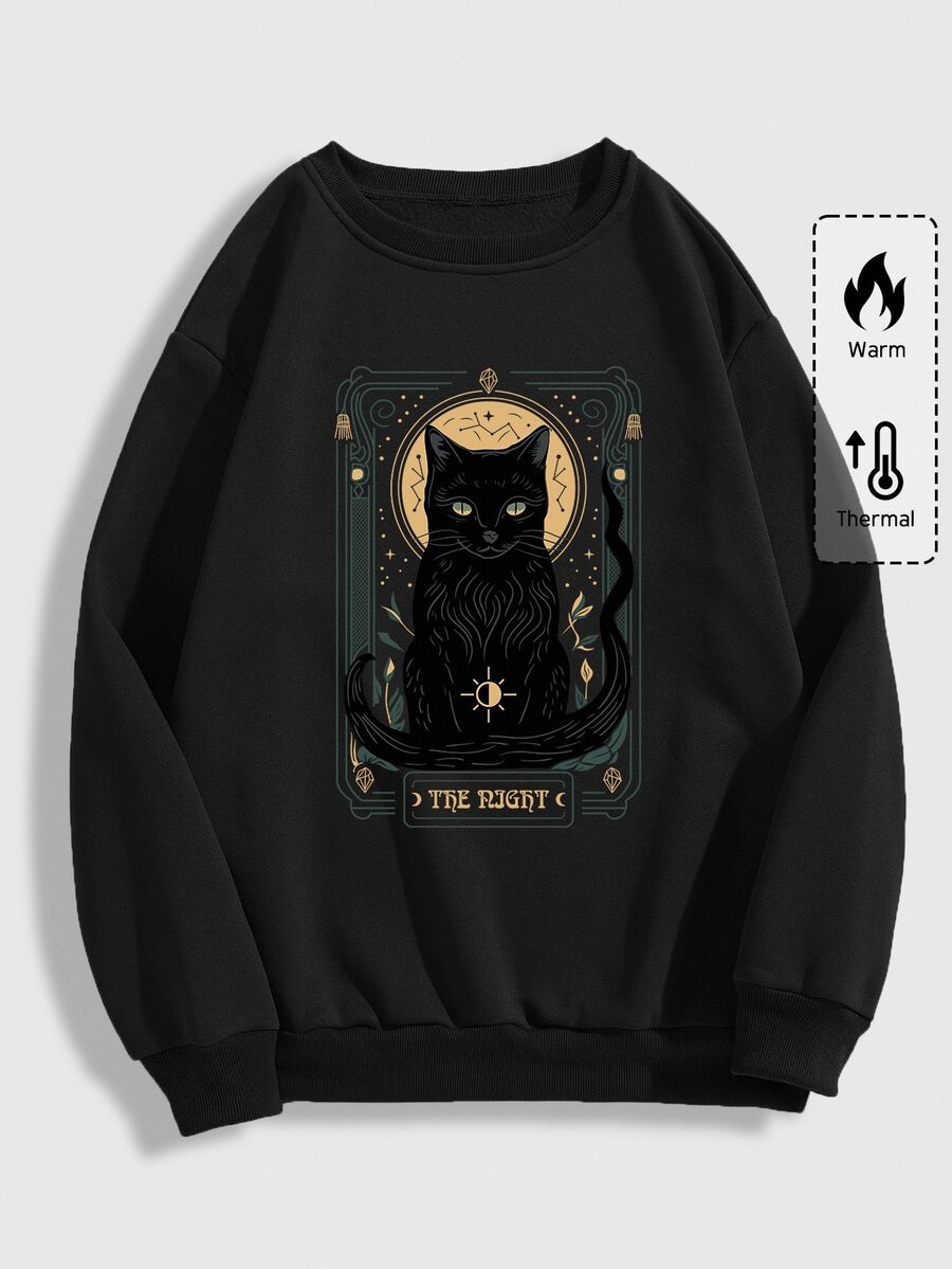 Goth Cat & Letter Graphic Thermal Lined Sweatshirt, School Graduation,Back To School Outfits,Graduation,Teacher Outfits For Women,Back To School