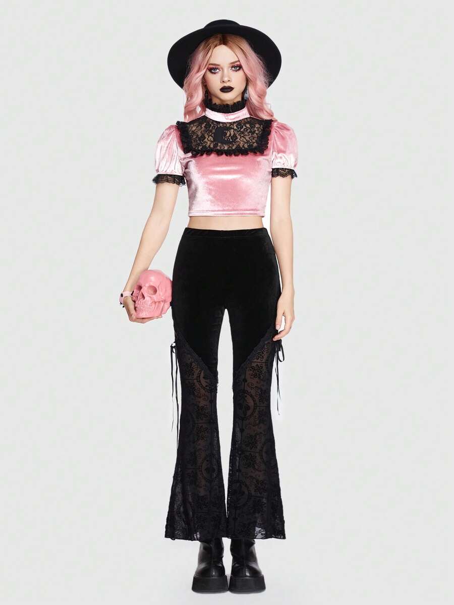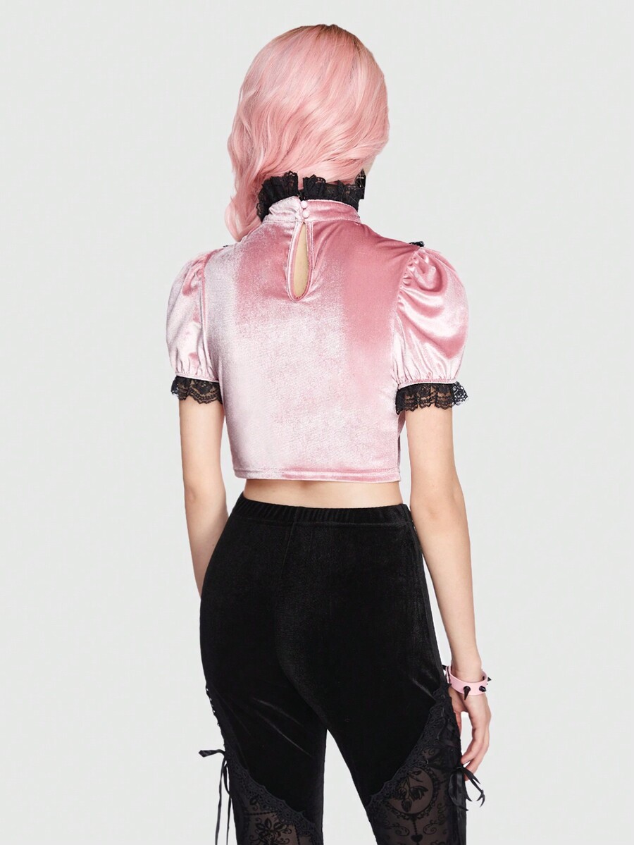 Goth Contrast Lace Frill Trim Mock Neck Puff Sleeve Velvet Top