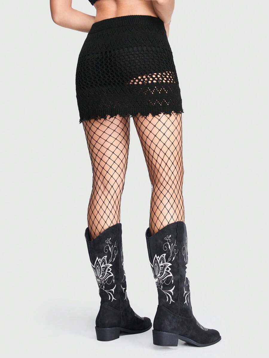 Goth Dark Boho Style Sweep Hem Distressed Low-Waist Knitted Sweater Skirt