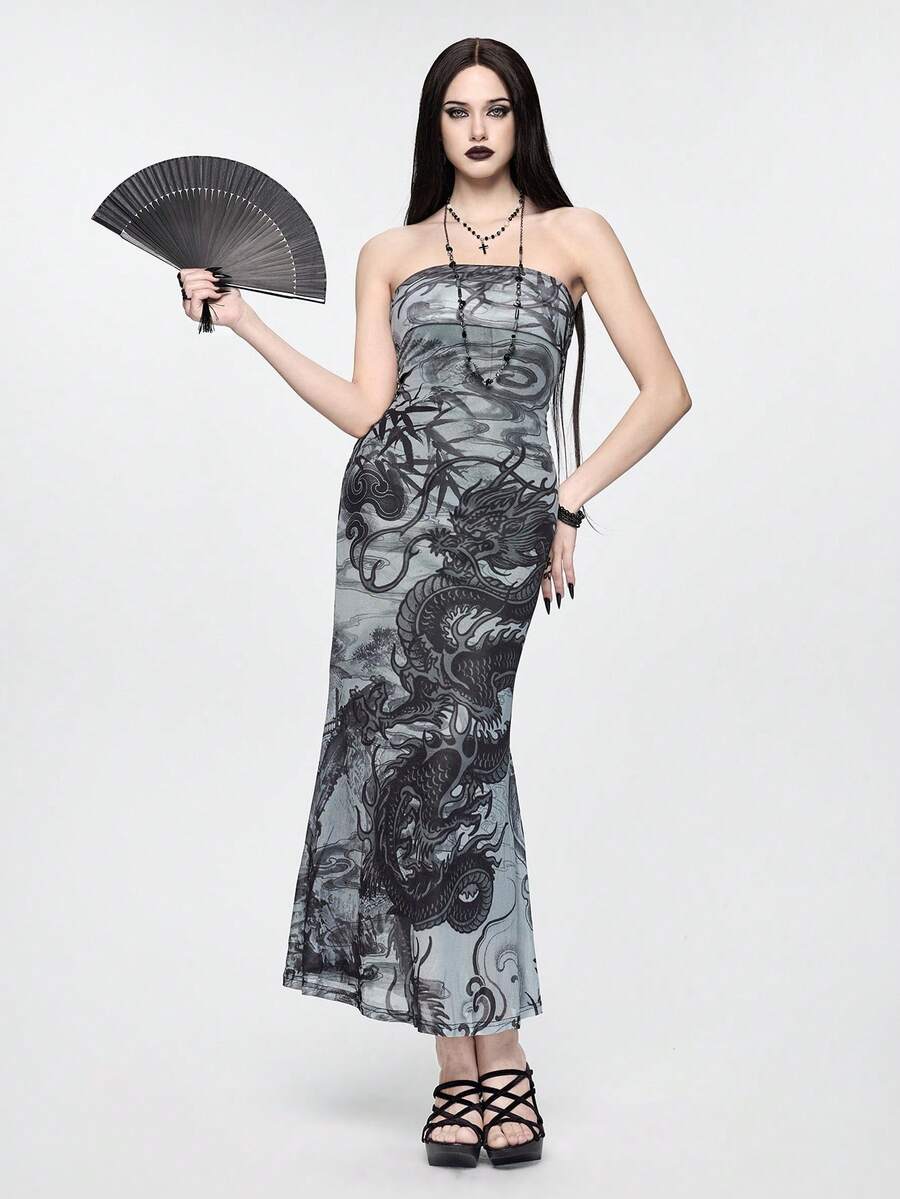 Goth Dark Chinese Style Shanhaijing Dragon Print Fitted Mesh Dress For Women