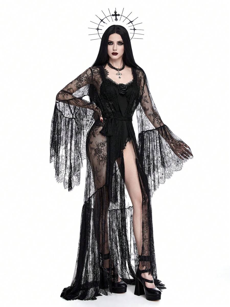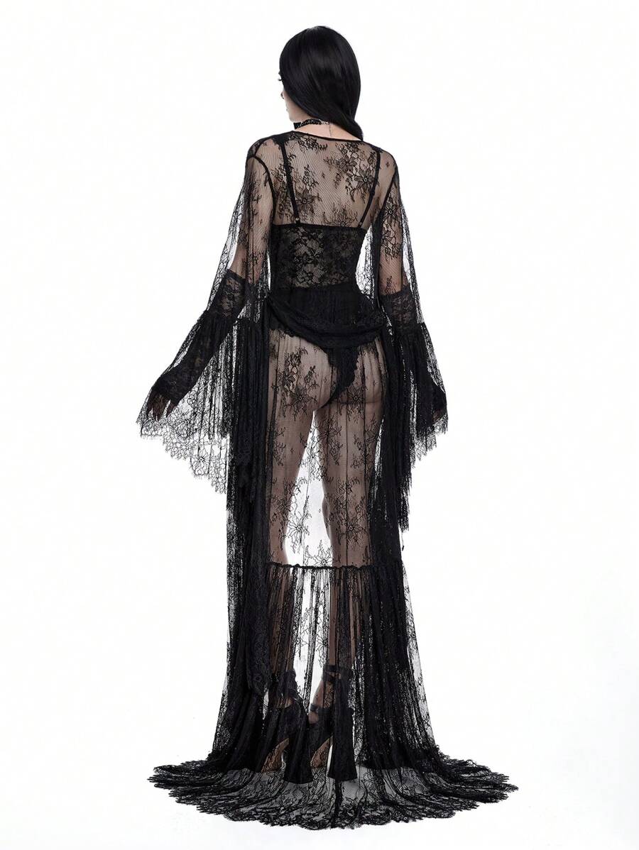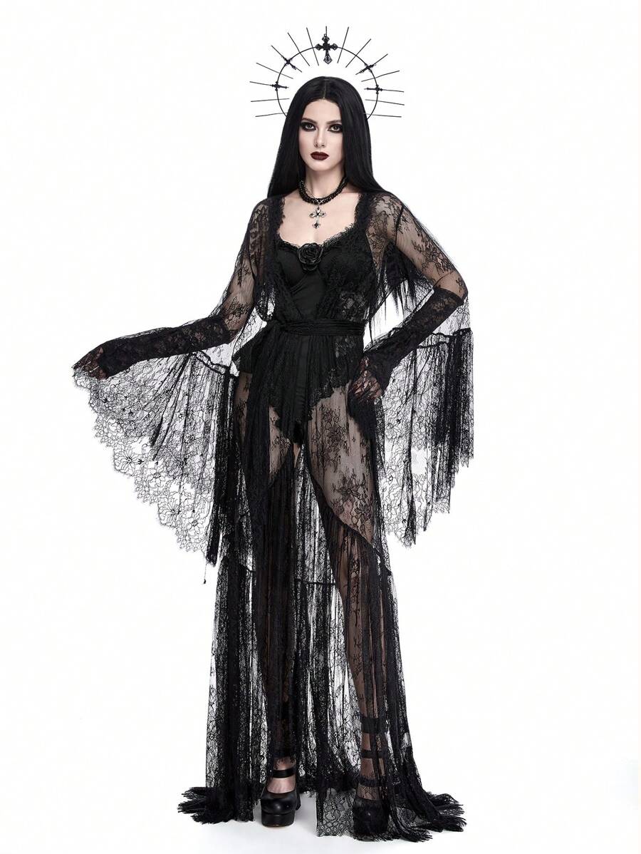 Dark Gothic Heavily Laced Open Front Flare Sleeve Floor-Length Sheer Cardigan For Women