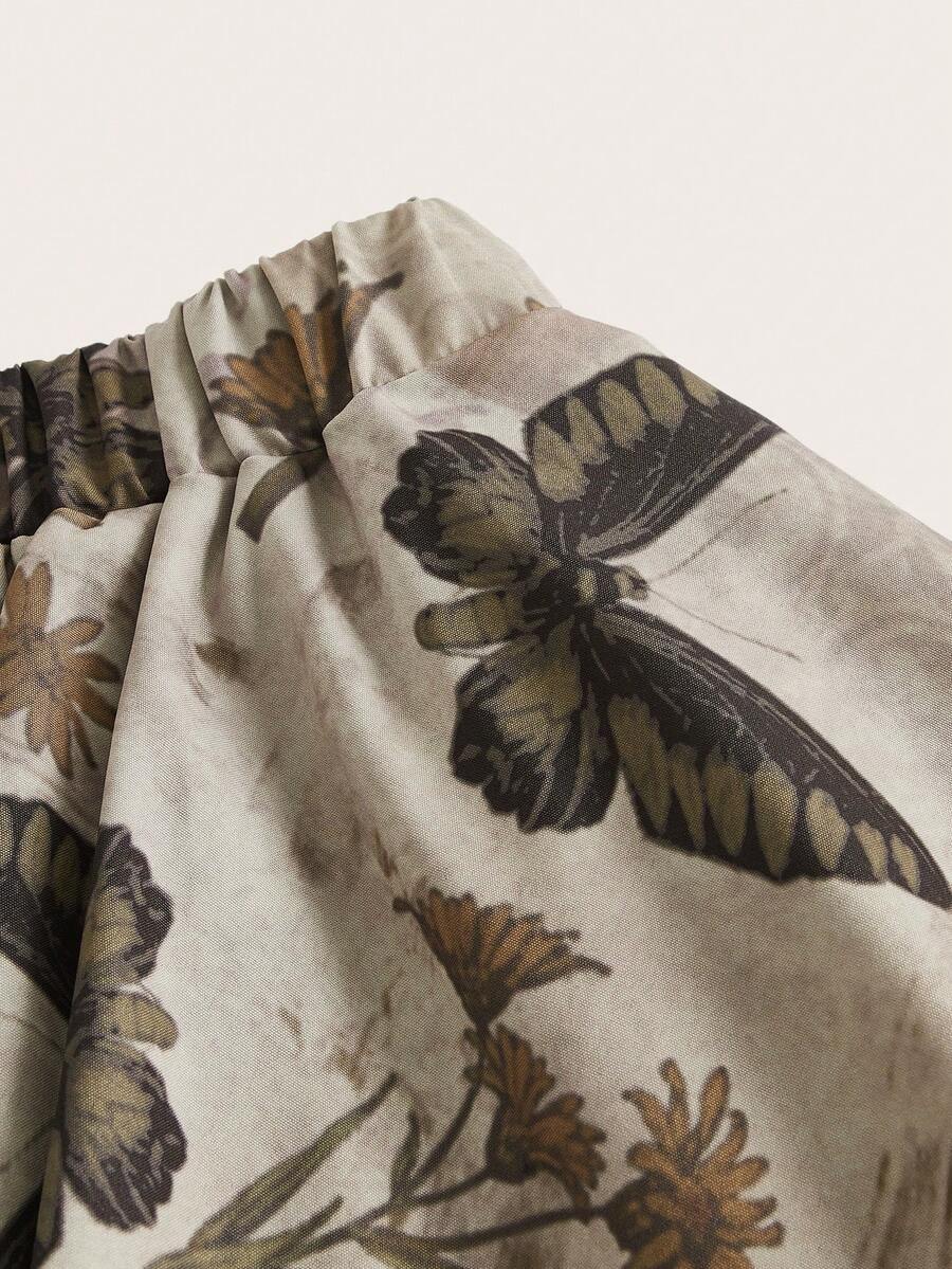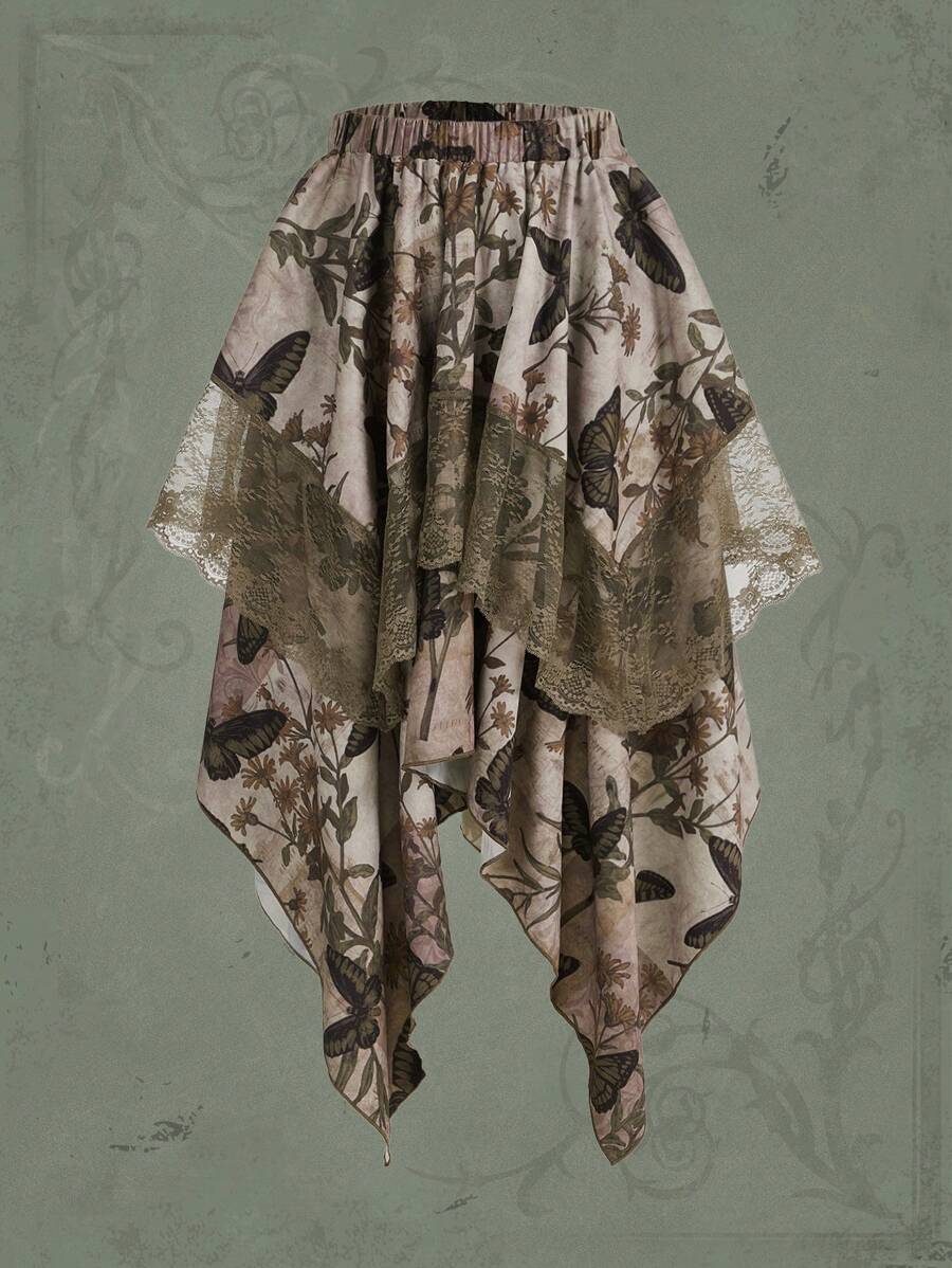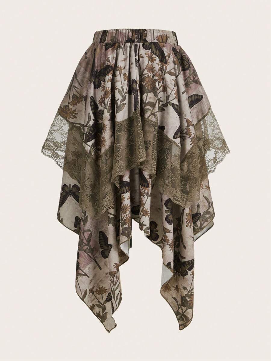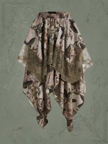 Goth Floral Print Contrast Lace Hanky Hem Skirt