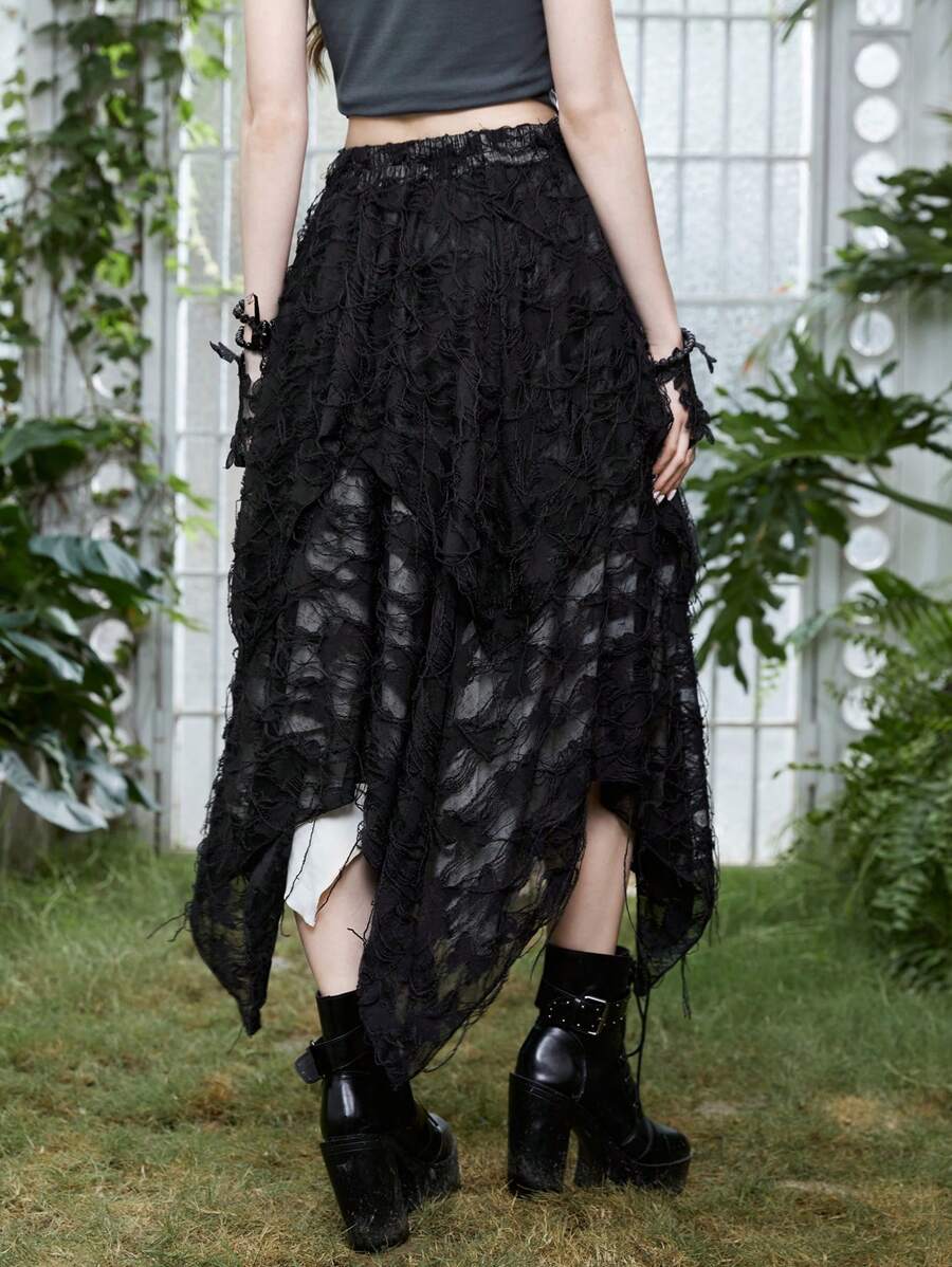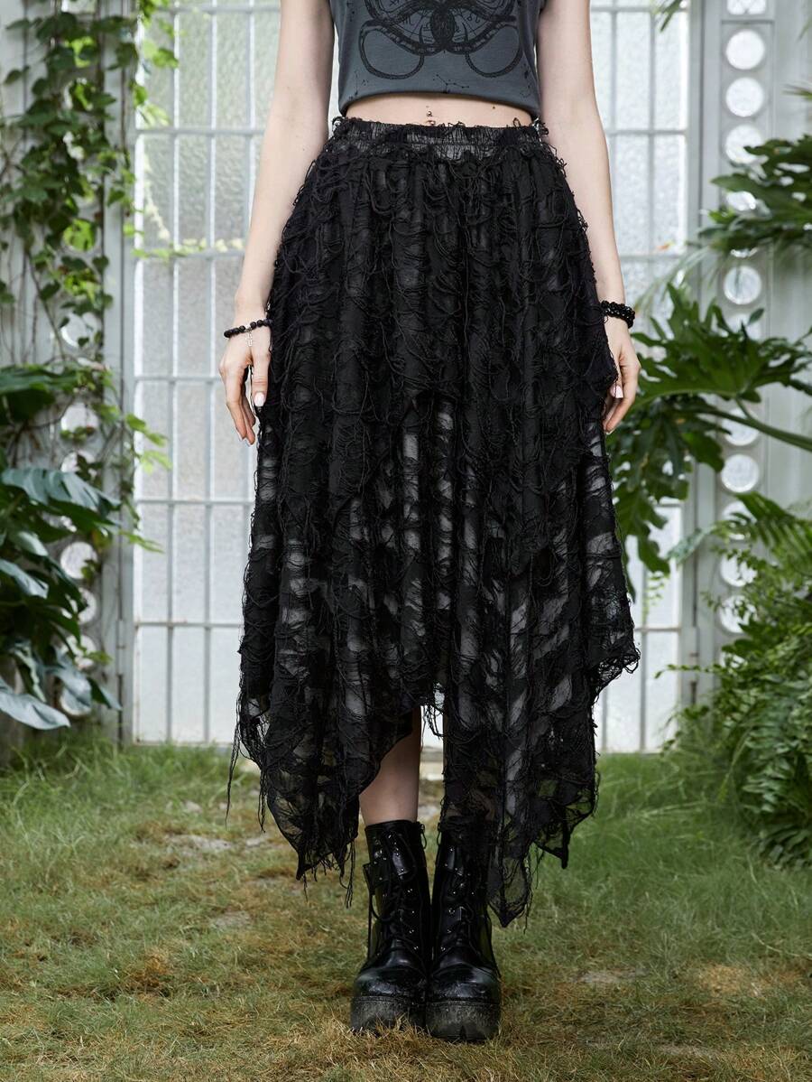 Goth Frayed Trim Ripped Asymmetrical Hem Skirt