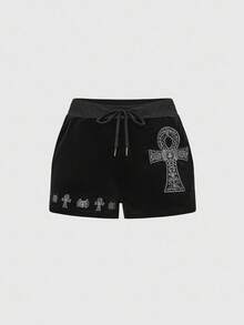 Goth Glamorous Palace-Style Rhinestone, Ruby, Crystal Teardrop, Sun, Sword, Heart, Eye, Star Embroidered Velvet Shorts, Suitable For Summer Party, Graduation, Ball, Beach Holiday