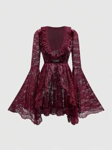 Gothic Baroque Style Contrast Lace Off Shoulder Flare Sleeve Women Velvet Top