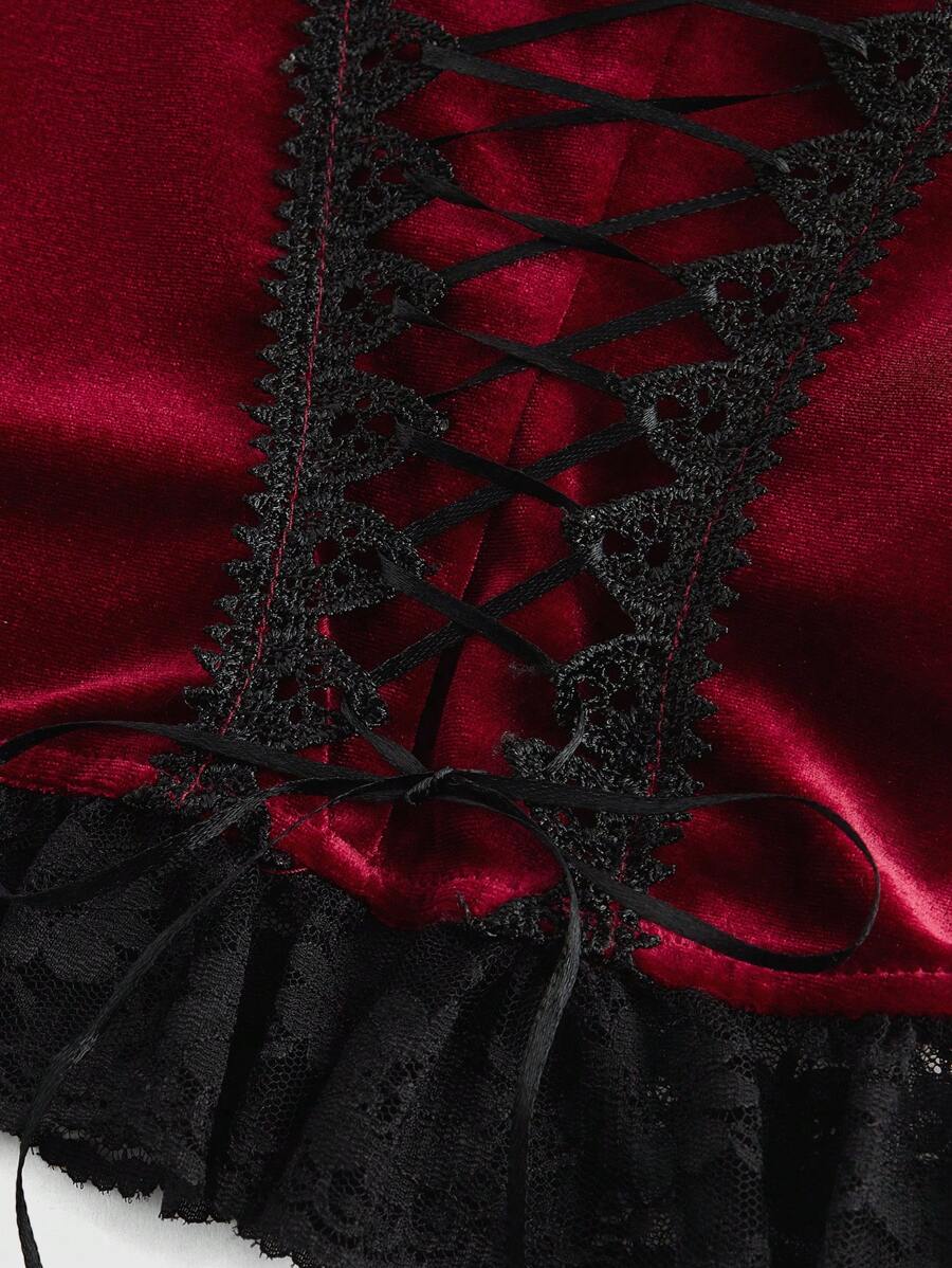 Gothic Christmas Palace Style Wine Red Velvet Lace Trim Fitted Bustier Top For Women