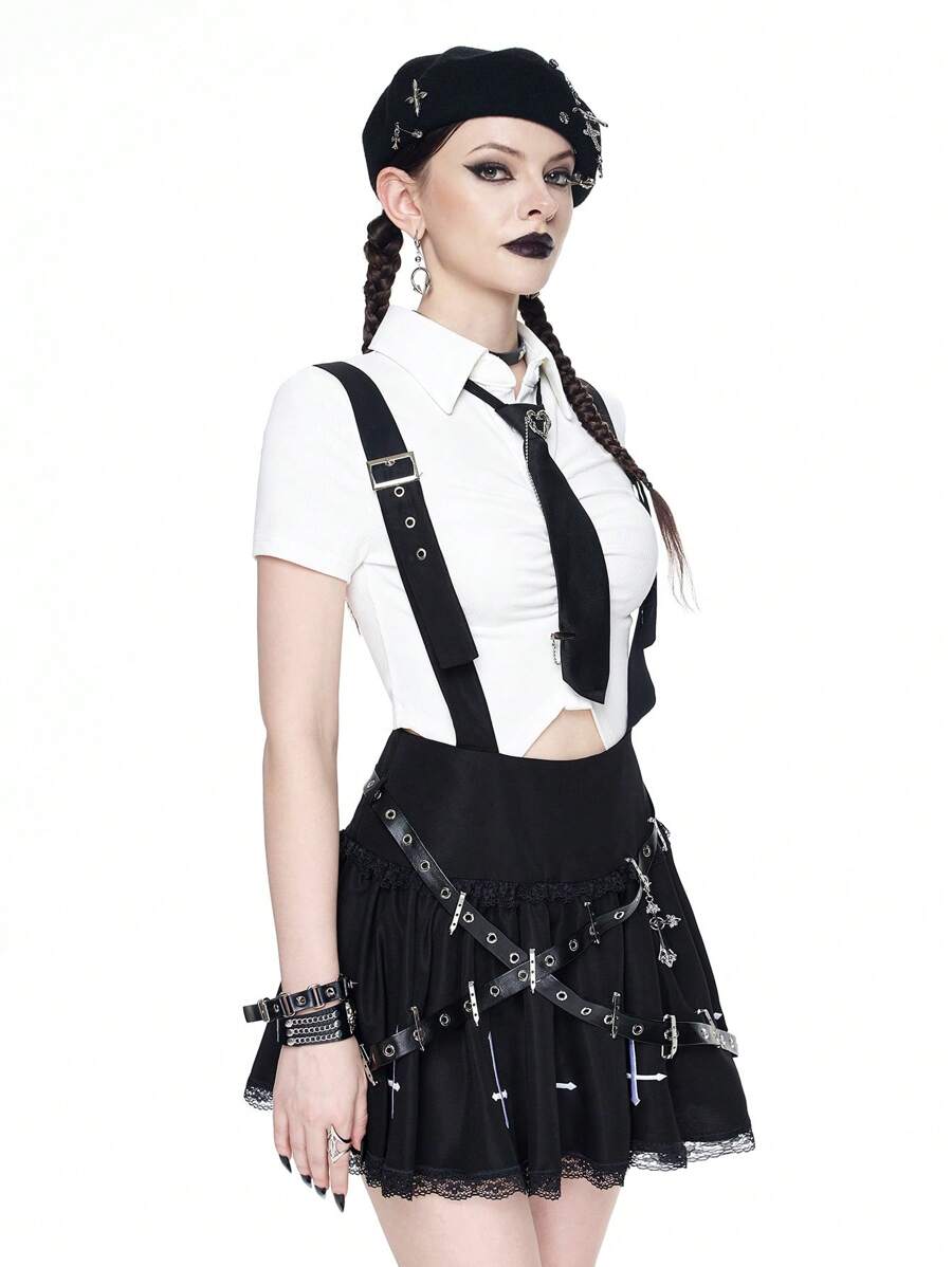 Gothic Cross Pendant Suspender Design With Lace Trim Skirt, Collegiate Style For Women