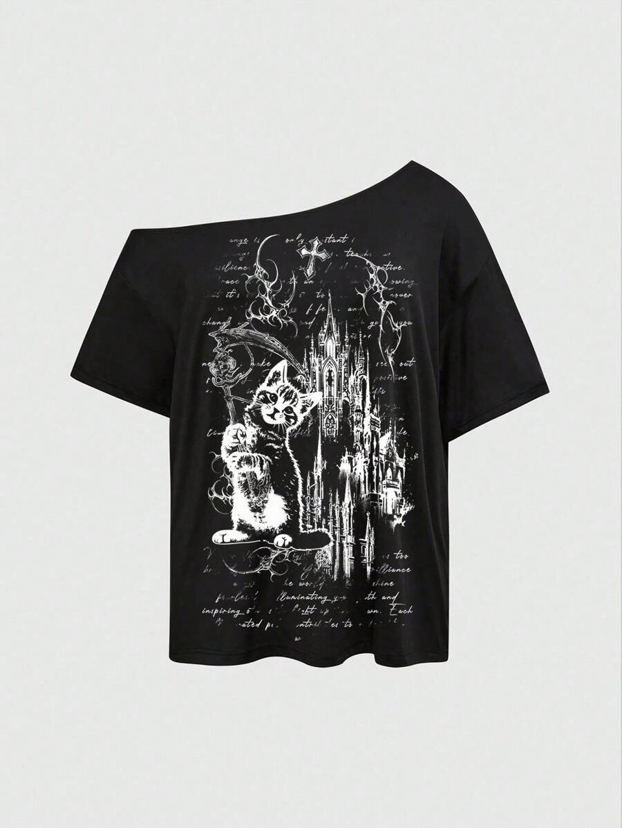 Gothic Dark Castle Black & White Print Poetry Slogan Cross Thorn Sexy Asymmetrical Shoulder Black Solid Basic Vintage Plus Size Asymmetrical Shoulder T-Shirt