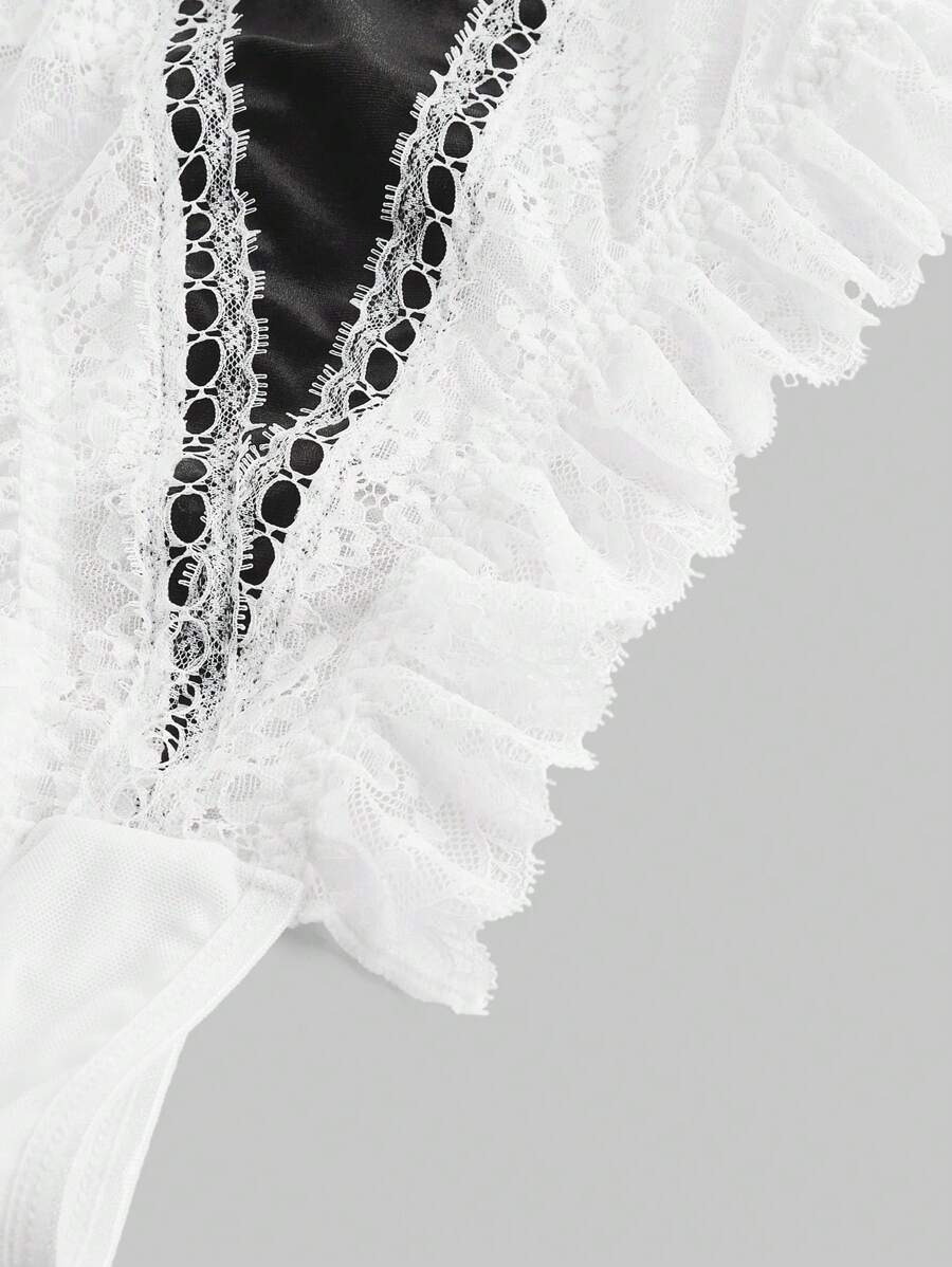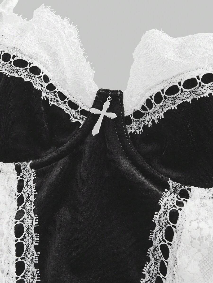 Gothic Dark Style Cross Decor Velvet & Lace Fabric One-Piece Jumpsuit With Underwire, Sexy
