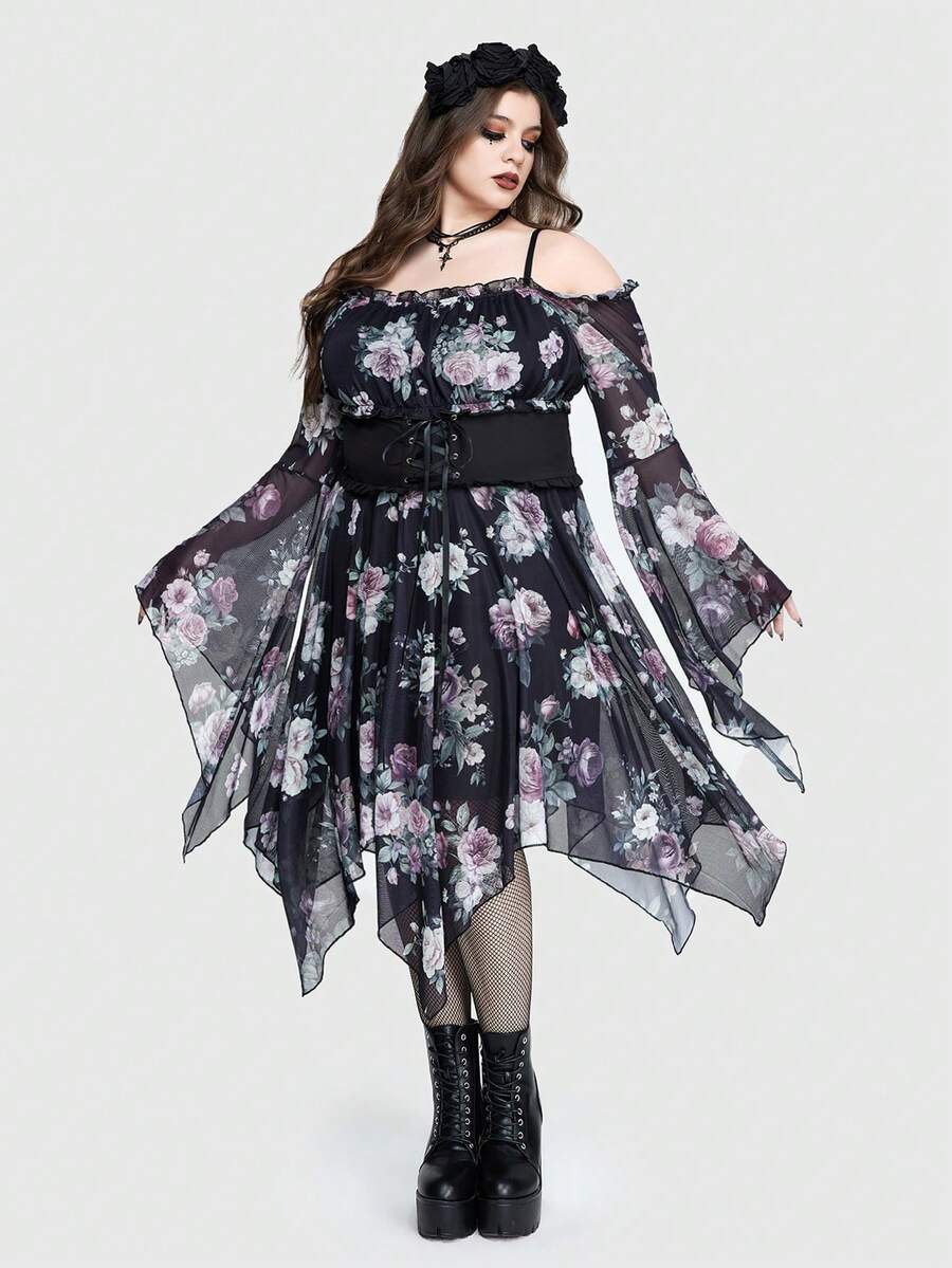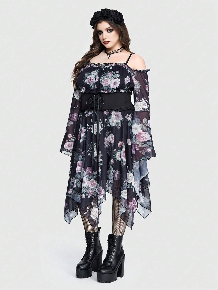 Gothic Palace Style Floral Allover Print Plus Size Off Shoulder Asymmetrical Hem Mesh Dress