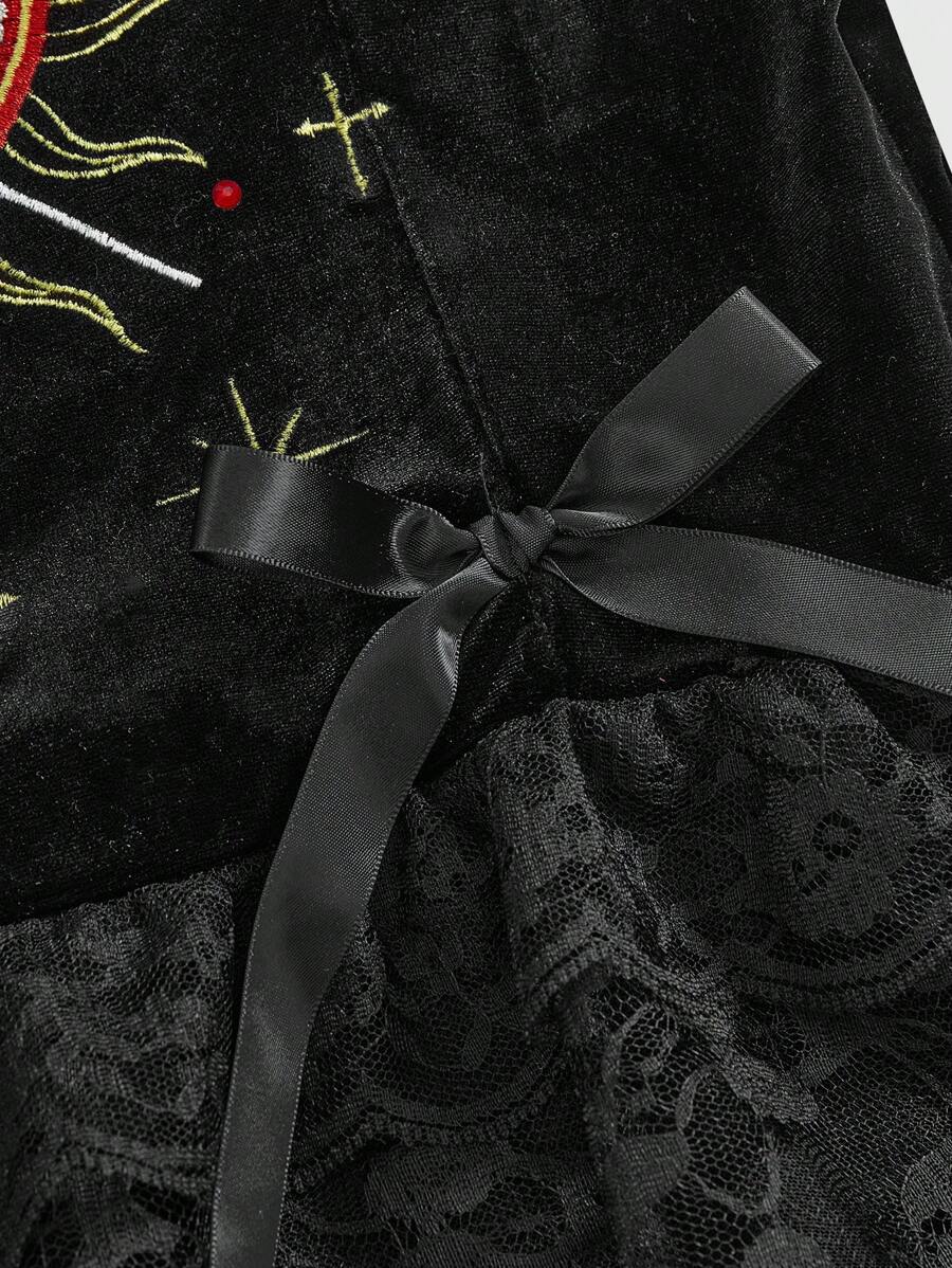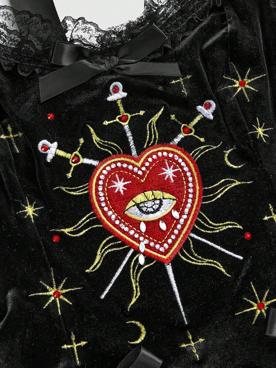 Halloween Gothic Retro Palace Style Heart Eyes Star Moon Embroidered Rhinestone Contrast Color Lace Trim Women Velvet Dress