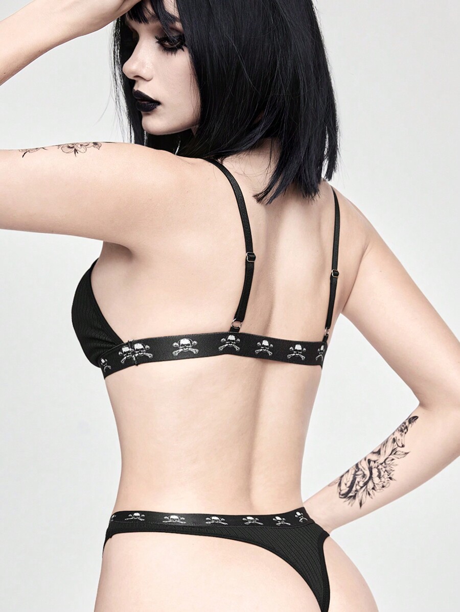 Gothic Skeleton Textured Knit Wireless Bra Set For Women