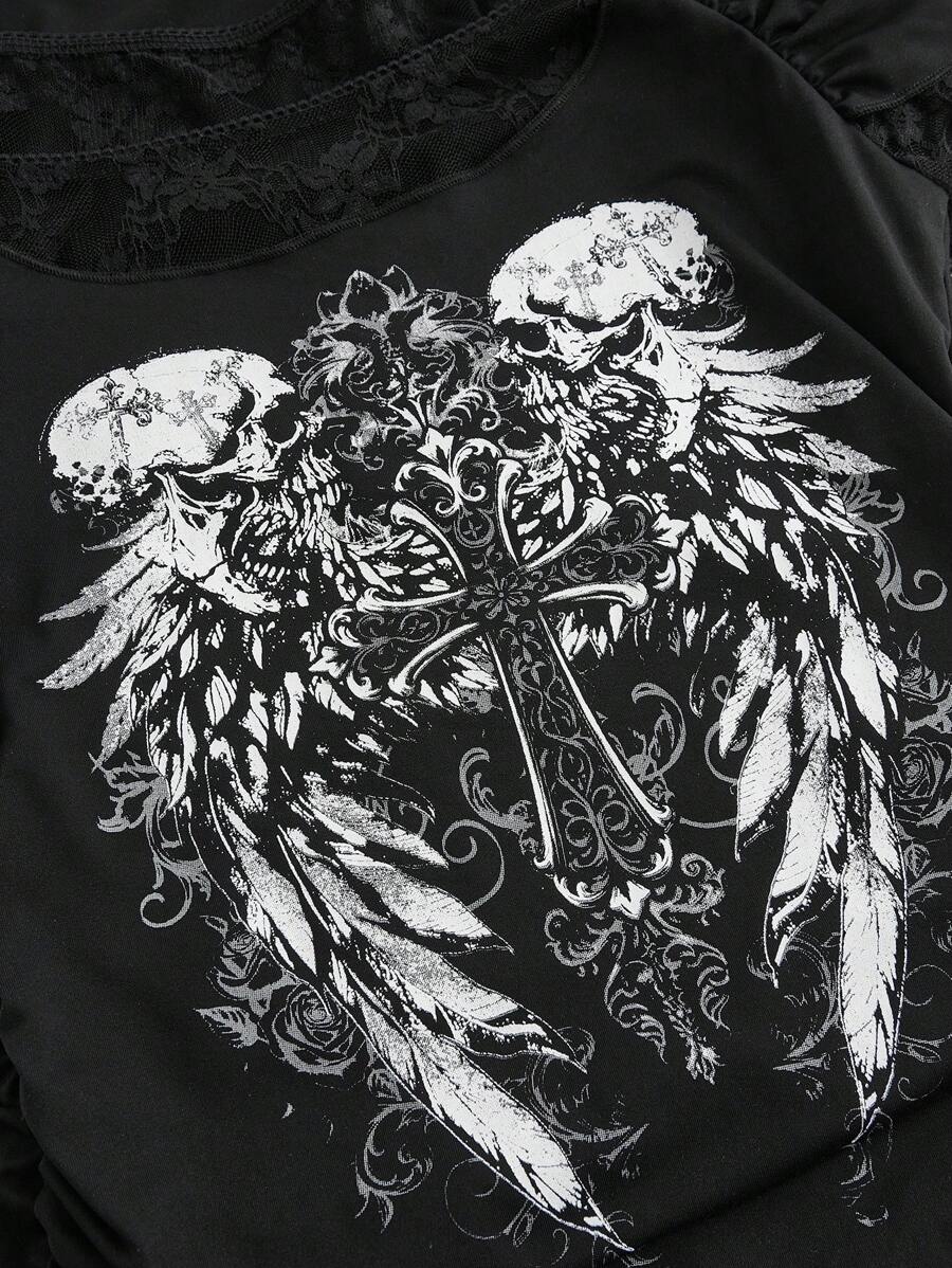 Gothic Skull Wing Floral Lace Splice Design T-Shirt Top For Women