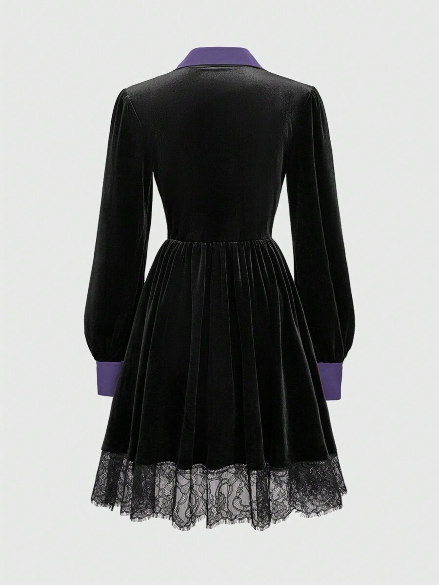 Gothic Style Purple Lace Patchwork Velvet Waist Dress, For Valentine's Day