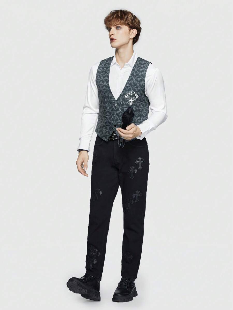 Goth Guys Geo Print Button Front Vest Without Shirt