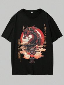 Anime Men Japanese Letter & Dragon Graphic Tee