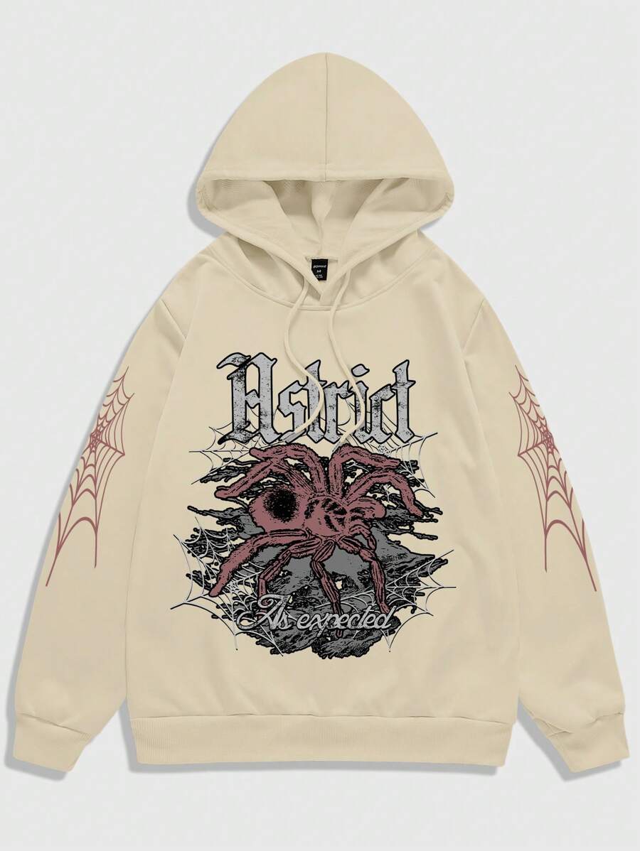 Goth Men Spider & Letter Print Hooded Sweatshirt With Long Sleeves