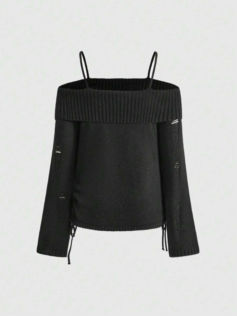 Goth Kpop Punk Cross Cutout Off-Shoulder Fitted Sweater