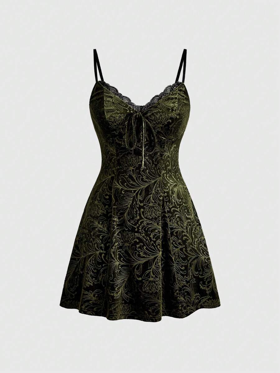 Goth Lace Patchwork Velvet Embossed Camisole A-Line Dress