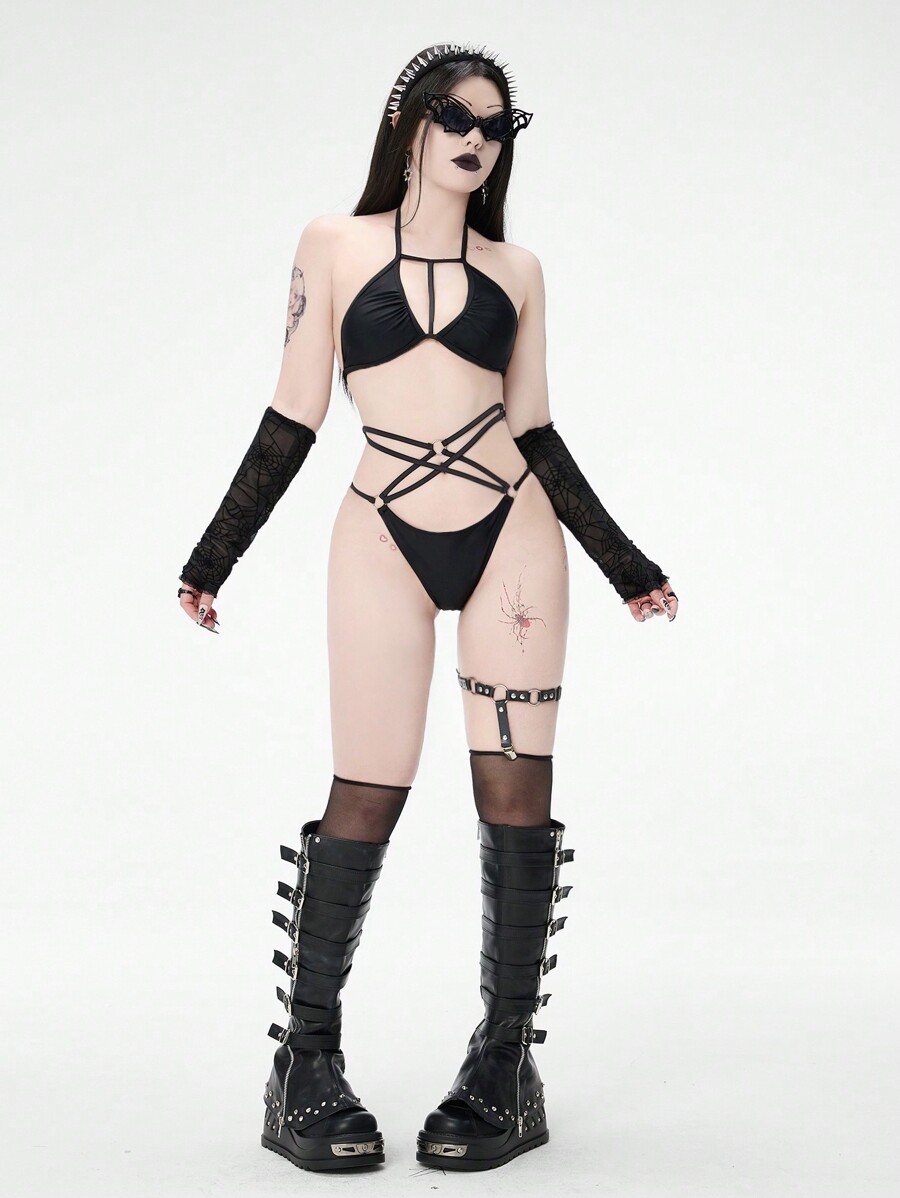 Goth Ladies' Solid Color Hollow Out Halter Strap Bikini Set For Summer Beach