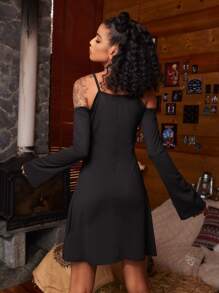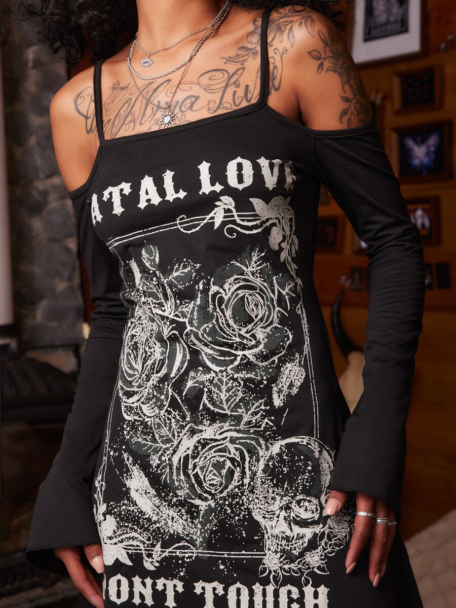 Goth Letter Floral Graphic Cold Shoulder Dress