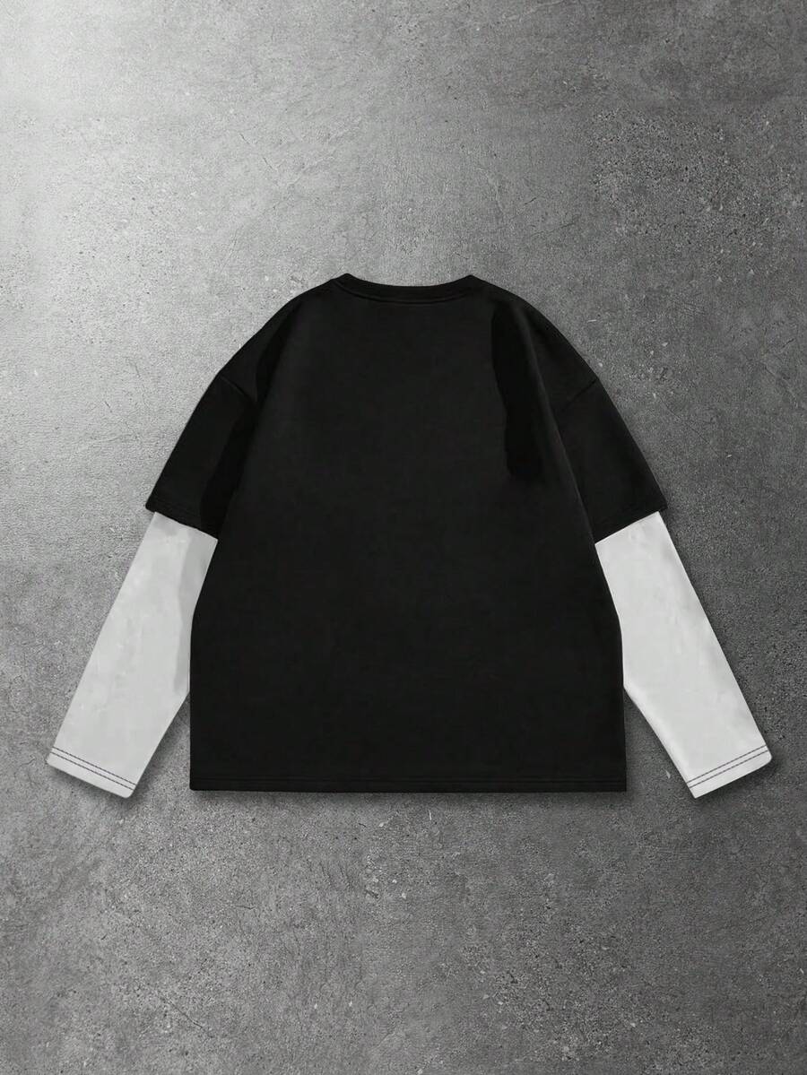 Goth Men's Casual Fashionable Street Slogan Print Contrast Color Long Sleeve 2 In 1 T-Shirt, Spring/Autumn