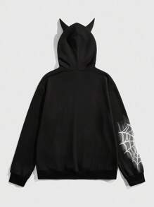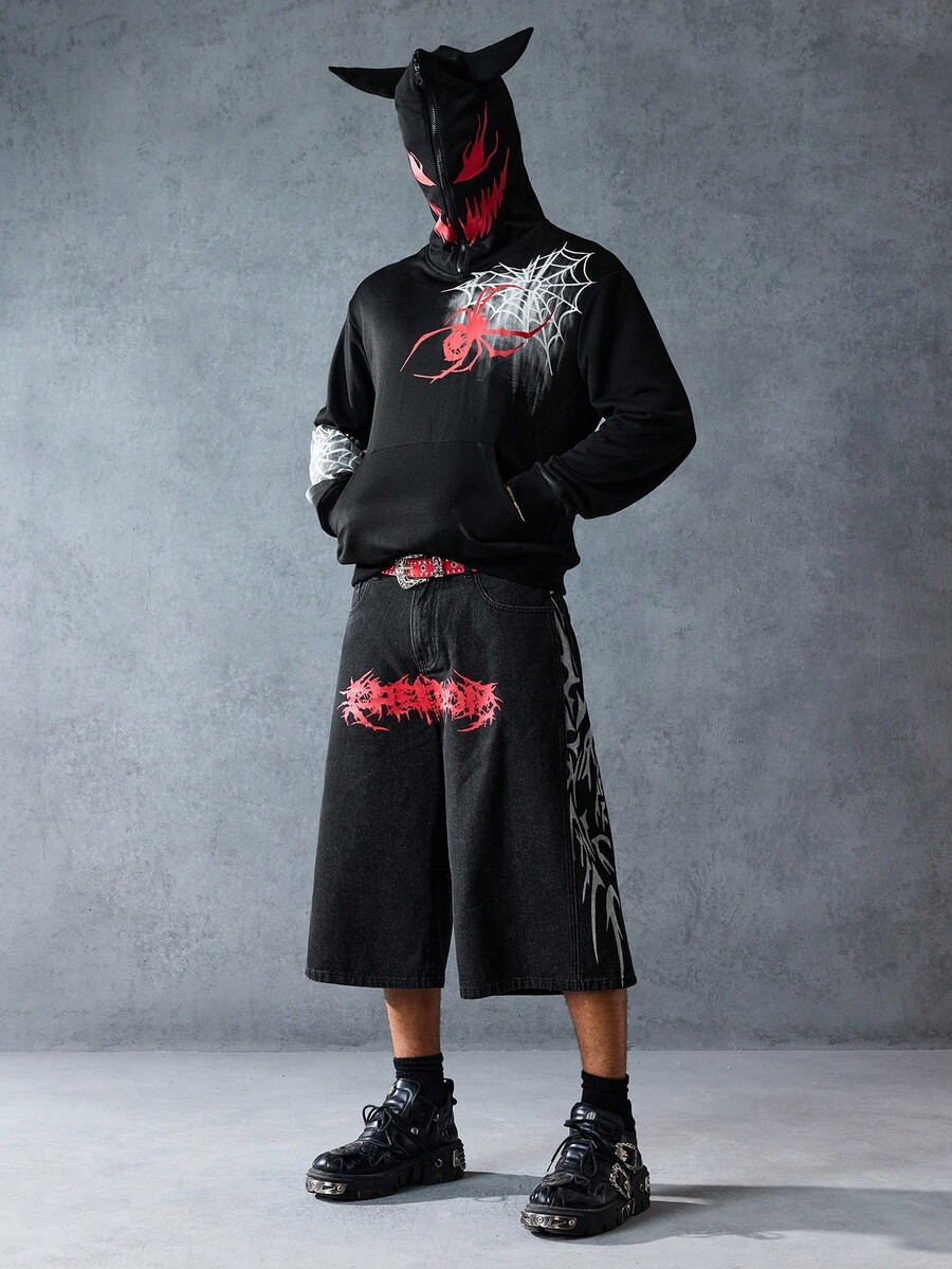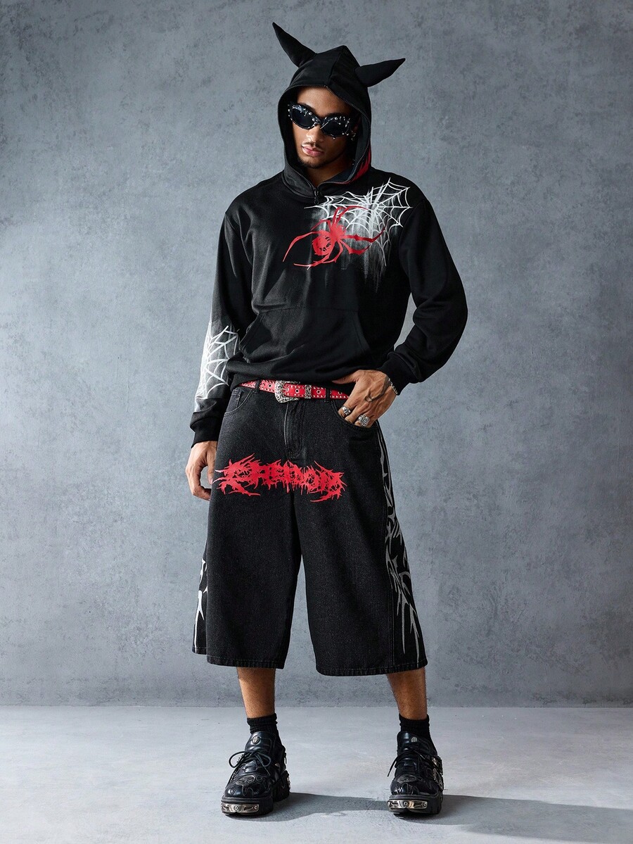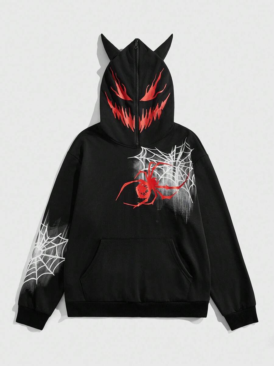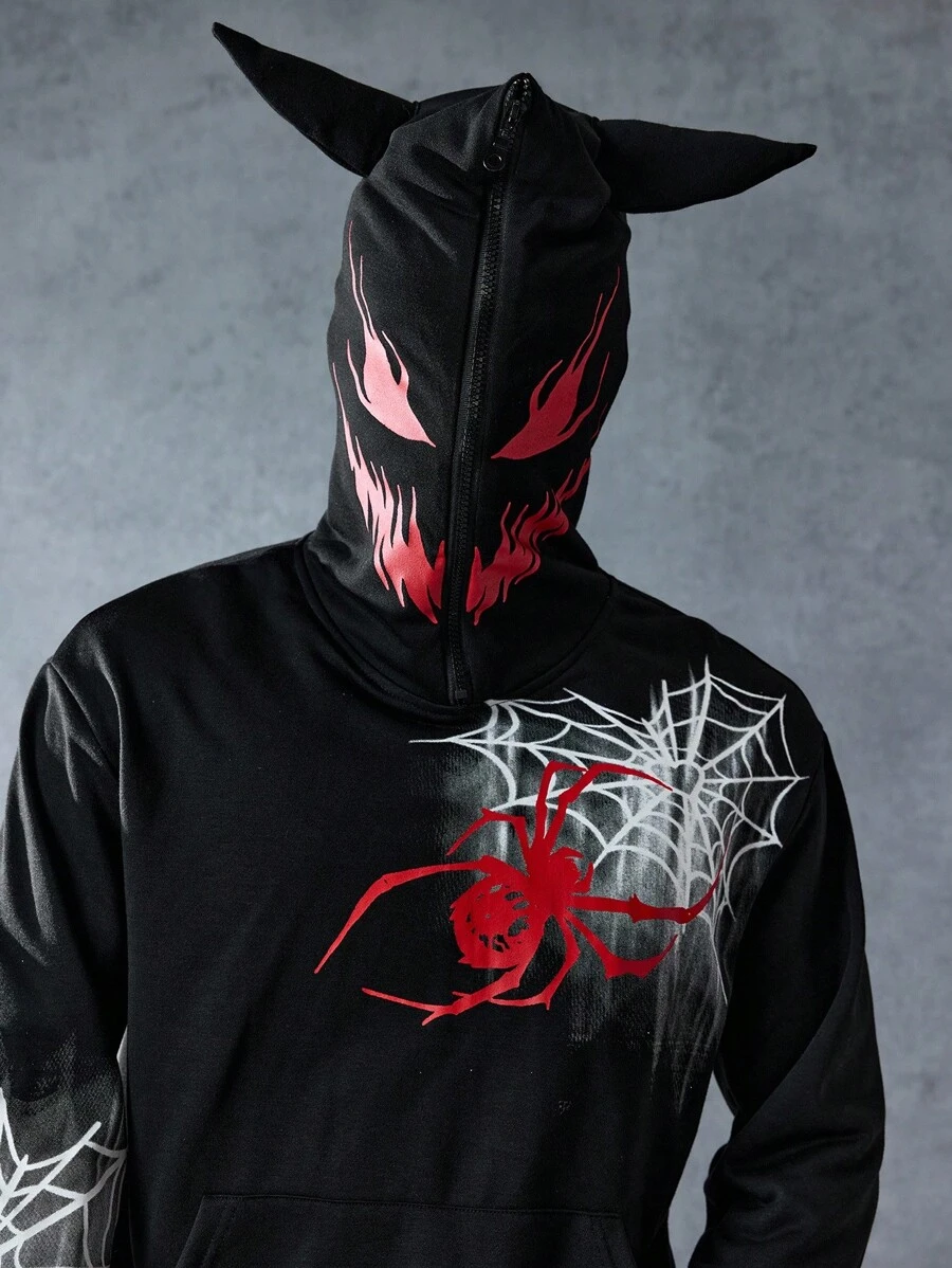 Goth Men's Fashion Spider Web Print Asymmetric Hoodie, Halloween
