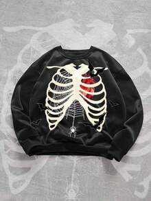 Goth Men's Fleece Skeleton Heart Spider Web Print Crew Neck Pullover Sweatshirt, For Halloween