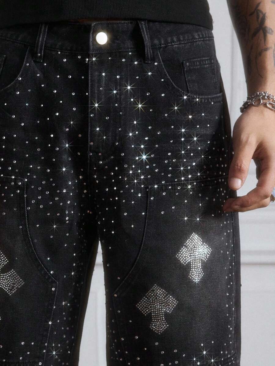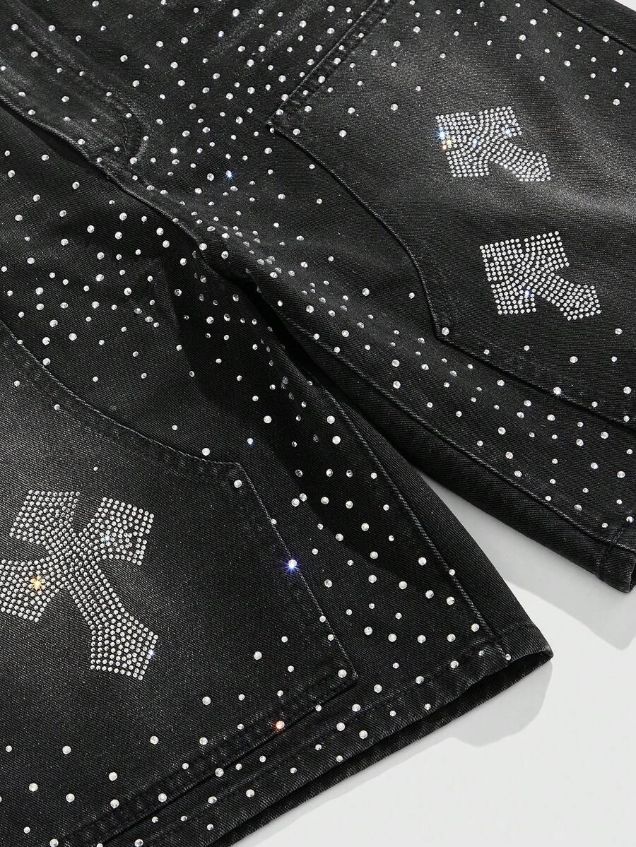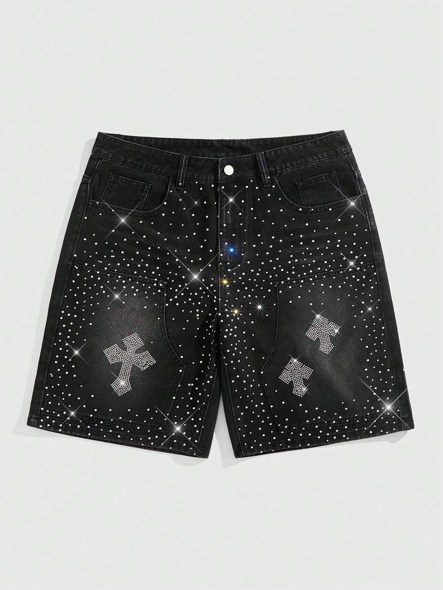 Goth Men's Pockets Rhinestone Cross Design Casual Denim Shorts, Halloween