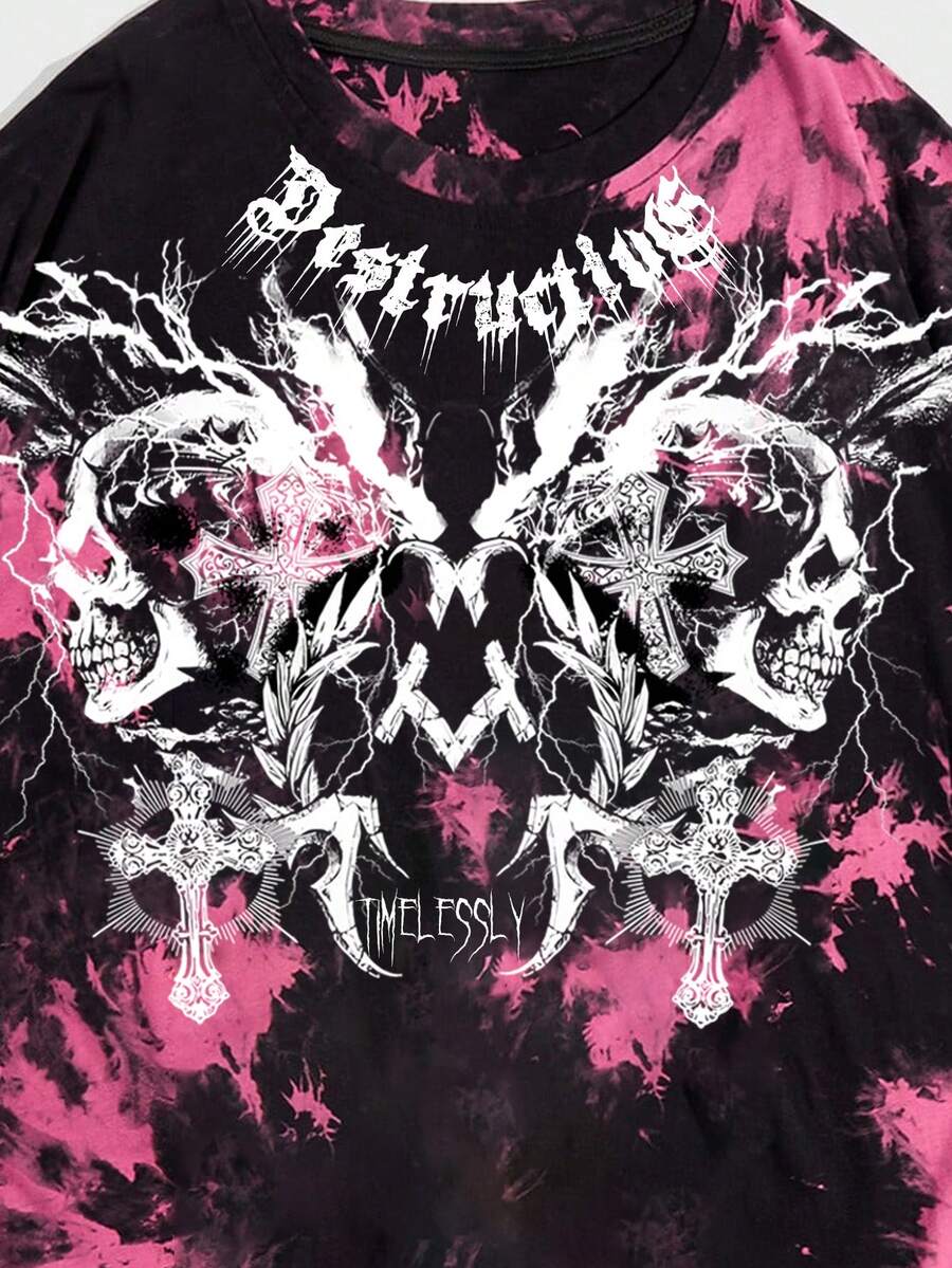 Goth Men's Summer Skull Tie-Dye Print Round Neck Short Sleeve Casual T-Shirt And Drawstring Waist Shorts Set