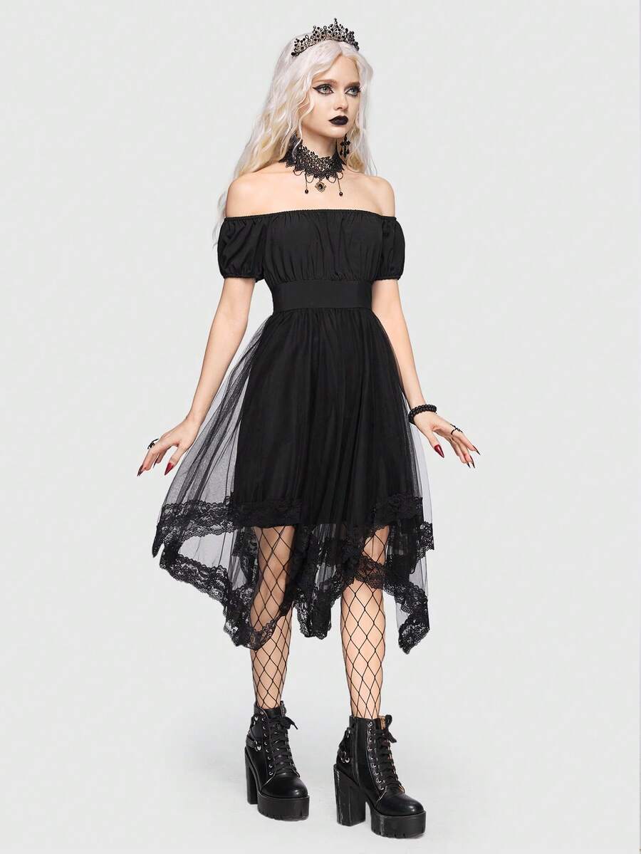 Goth Off Shoulder Mesh Overlay Dress Without Corset
