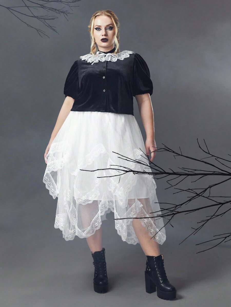 Goth Plus Contrast Lace Puff Sleeve Velvet Tee