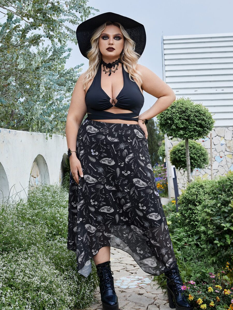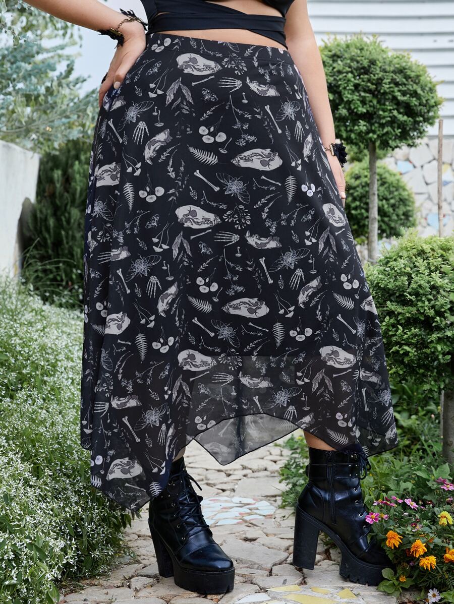 Goth Plus Plants & Skeleton Graphic Asymmetrical Hem Mesh Skirt