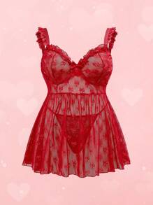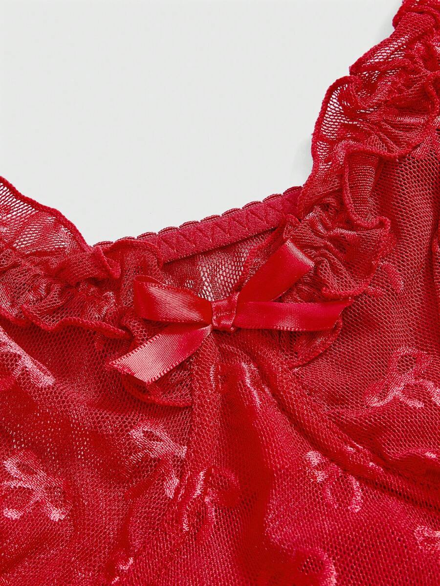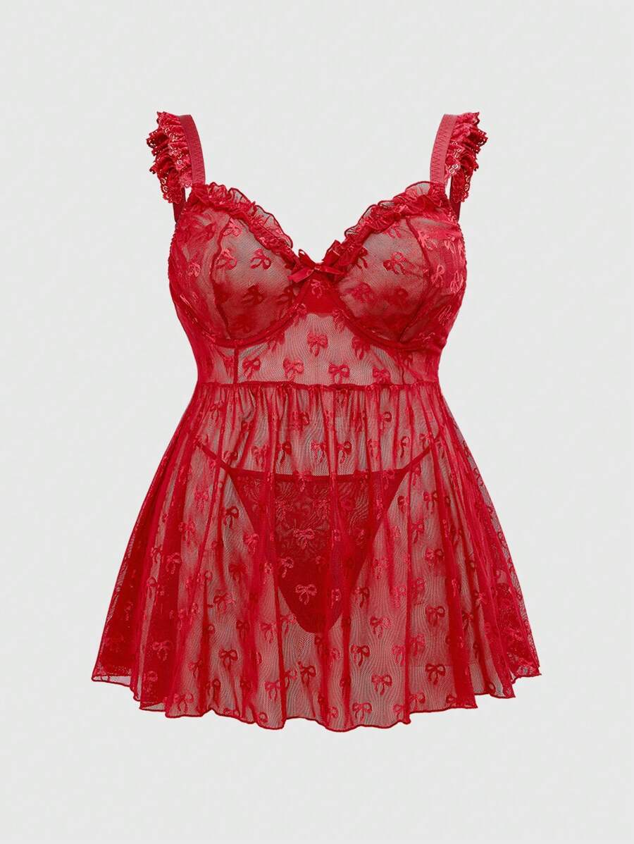 Goth Plus Size Dark Romantic Bow Jacquard Fabric Mix Lace Trim Sling Dress And G-String Sexy Lingerie Set