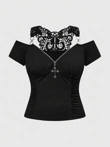 Plus Size Gothic Style Dark Butterfly Cross Zipper Sexy Camisole T-Shirt, Women Autumn Plus Size Short Sleeve Top