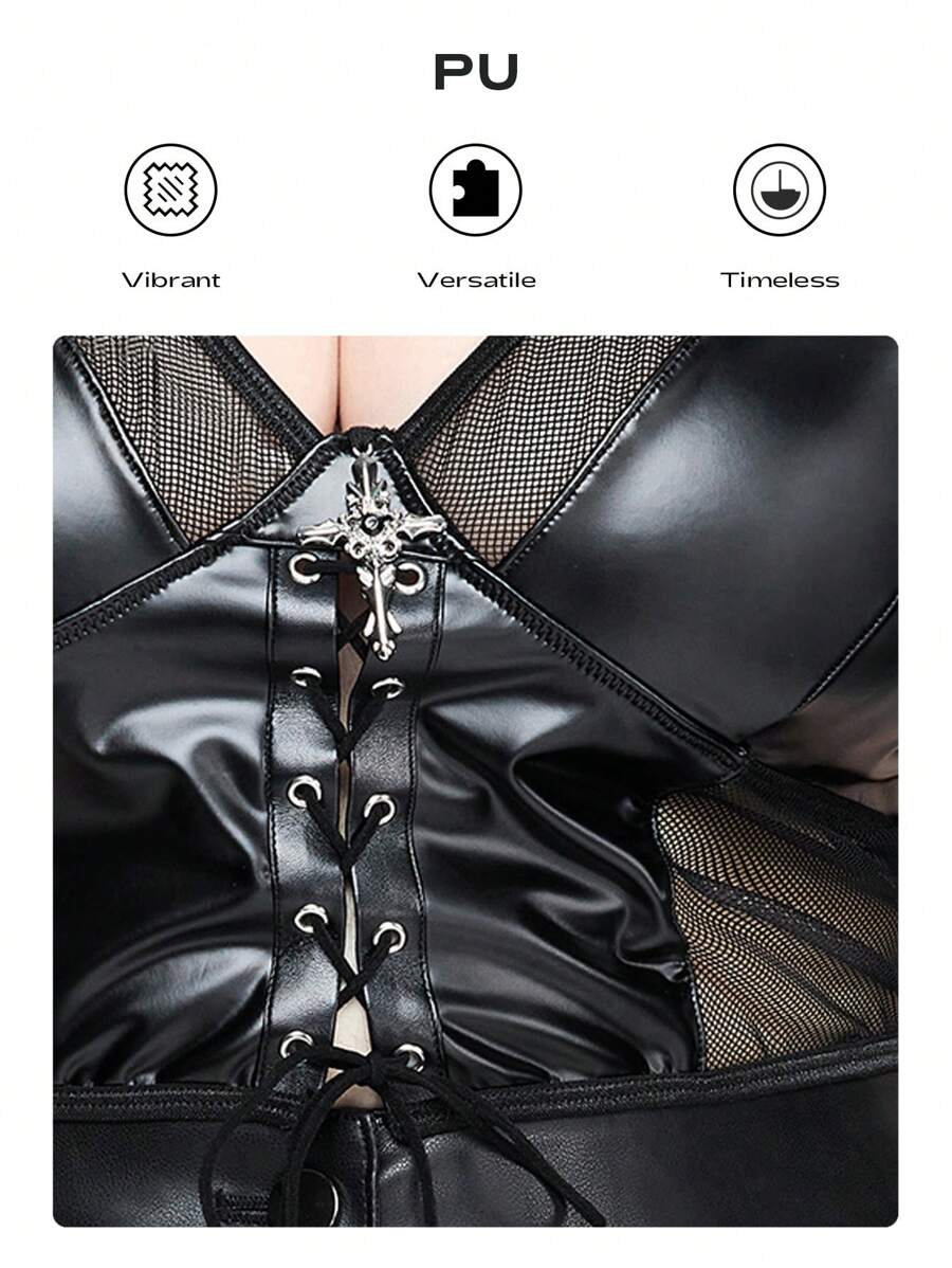 Plus Size Gothic Style Leather & Mesh Black Cami Top For Women, For Summer