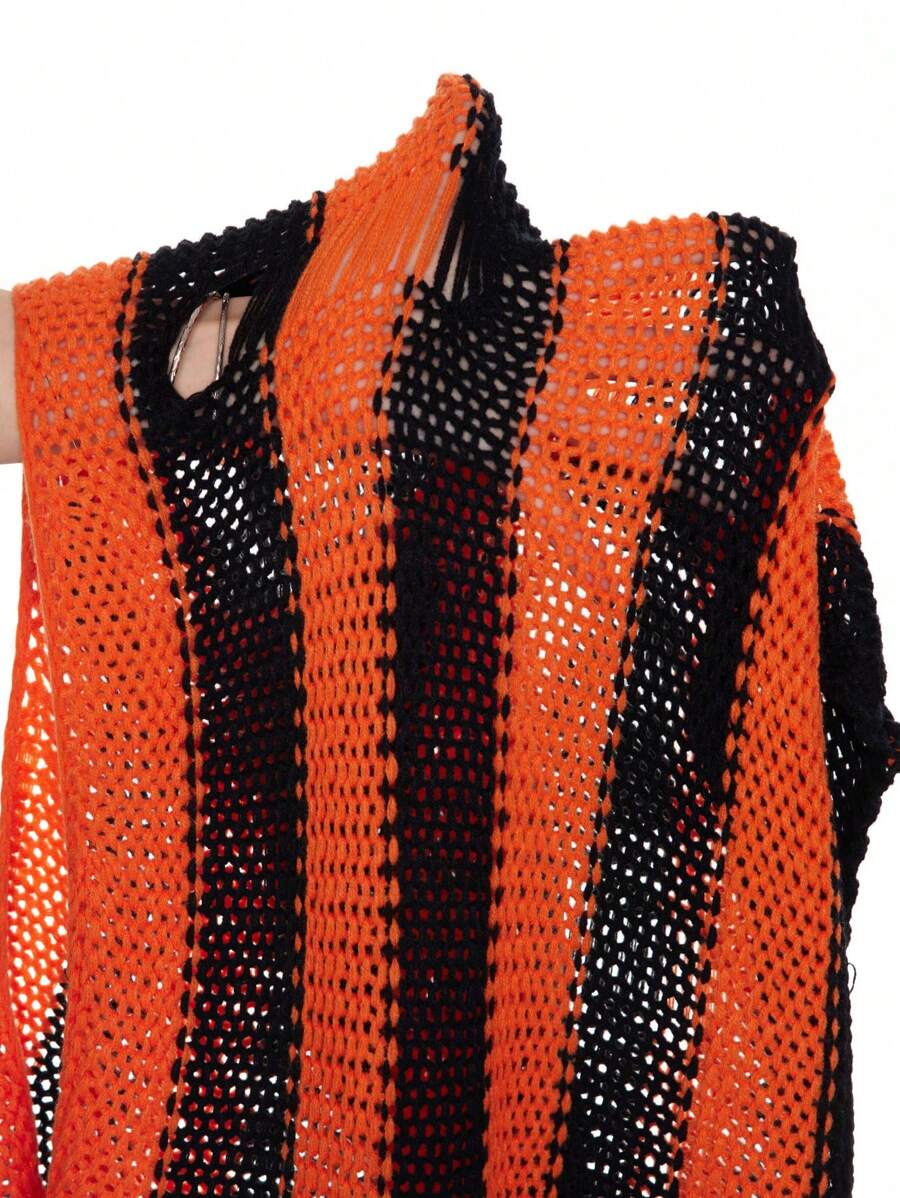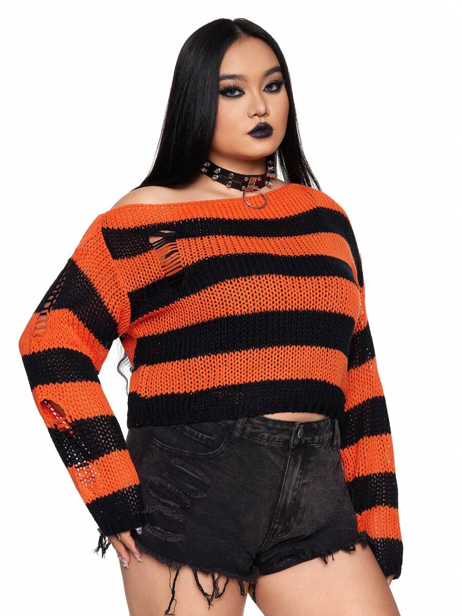 Goth Plus Size Oblique Shoulder Black & Orange Striped Distressed Pullover Sweater