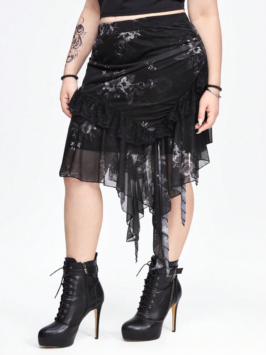 Goth Plus Size Women's Rose Lace Printed Asymmetrical Skirt With Ruffle Hem Design