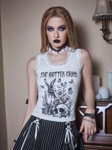 Goth Rabbit Skull Print Contrast Lace Tank Top