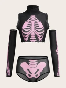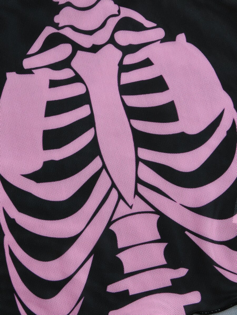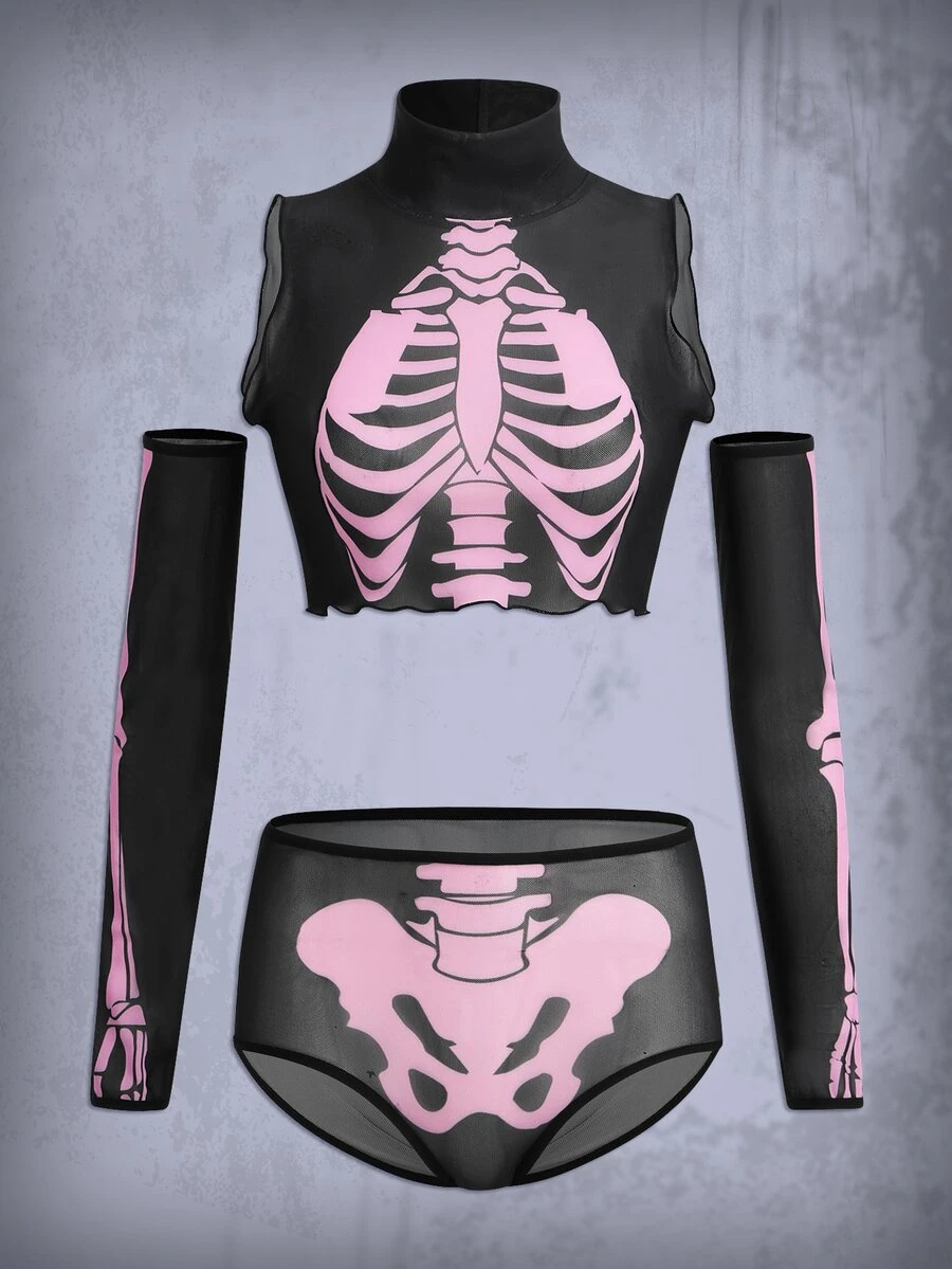 Goth Skeleton Print Mesh Lingerie Set With 1pair Oversleeves