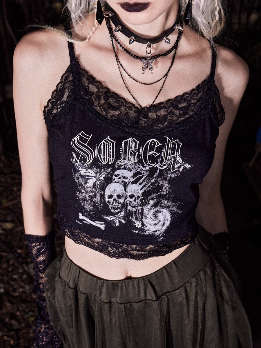 Goth Skull Graphic Contrast Lace Crop Cami