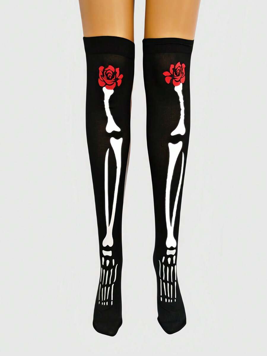 Goth Skull Rose Print Over-The-Knee Socks, Cosplay Stockings