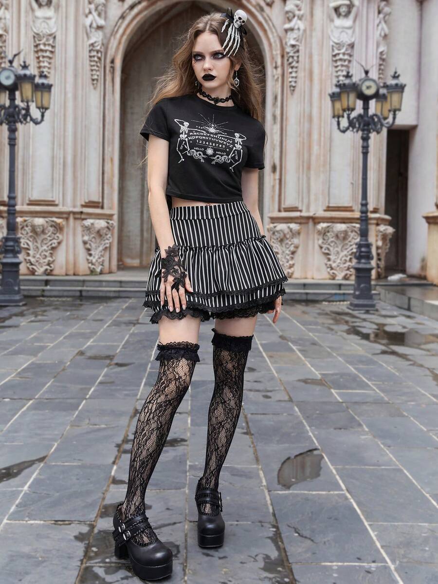 Goth Striped Contrast Lace Ruffle Hem Skort