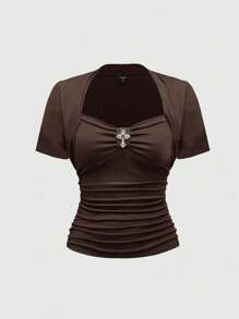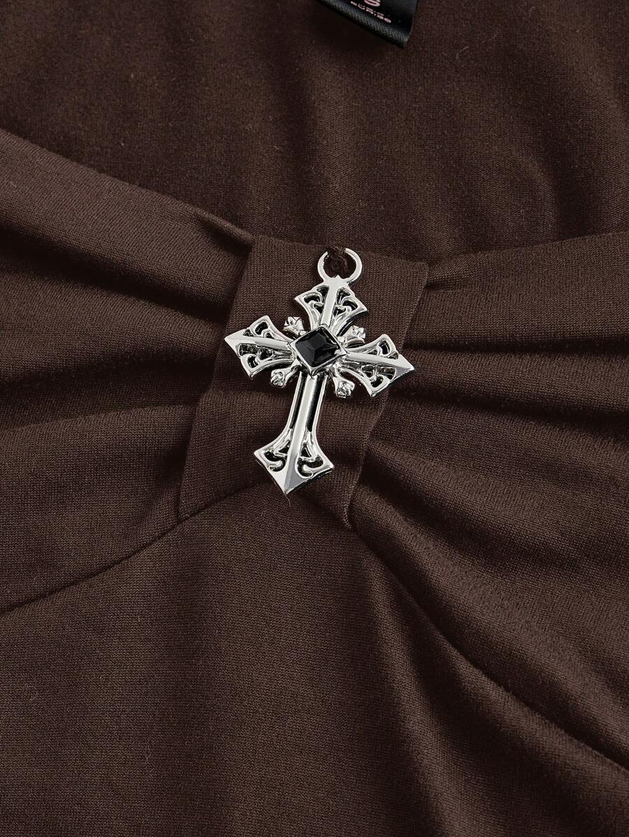 Valentine's Day Vintage Palace Gothic Cross Pendant Solid Black Square Neck Elastic T-Shirt For Women