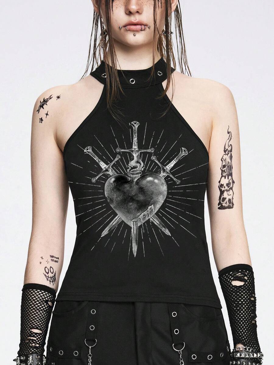 Vintage Gothic Knit Mock Neck Punk Style Backless Tank Top, Dark Heart Pattern, Tight Fit, Women Summer Graduation Outfits